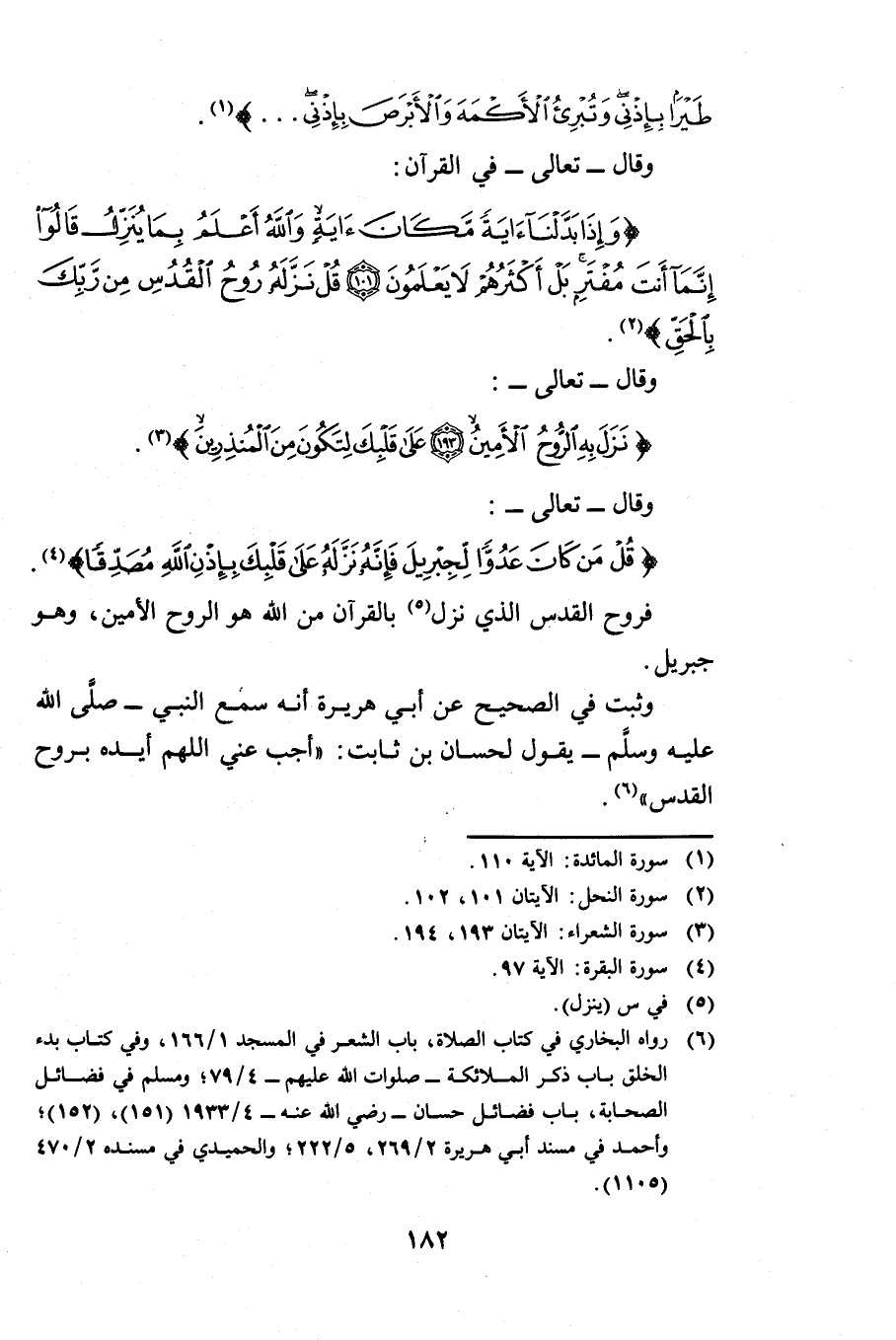 وَقَالَ - تَعَالَى -: فِي الْقُرْآنِ {وَإِذَا بَدَّلْنَا آيَةً مَكَانَ آيَةٍ وَاللَّهُ أَعْلَمُ بِمَا يُنَزِّلُ قَالُوا إِنَّمَا أَنْتَ مُفْتَرٍ بَلْ أَكْثَرُهُمْ لَا يَعْلَمُونَ} [النحل: 101] (101) {قُلْ نَزَّلَهُ رُوحُ الْقُدُسِ مِنْ رَبِّكَ بِالْحَقِّ} [النحل: 102] وَقَالَ - تَعَالَى -: {نَزَلَ بِهِ الرُّوحُ الْأَمِينُ} [الشعراء: 193] (193) {عَلَى قَلْبِكَ لِتَكُونَ مِنَ الْمُنْذِرِينَ} [الشعراء: 194] وَقَالَ - تَعَالَى -: {قُلْ مَنْ كَانَ عَدُوًّا لِجِبْرِيلَ فَإِنَّهُ نَزَّلَهُ عَلَى قَلْبِكَ بِإِذْنِ اللَّهِ مُصَدِّقًا} [البقرة: 97] فَرُوحُ الْقُدُسِ الَّذِي نَزَلَ بِالْقُرْآنِ مِنَ اللَّهِ هُوَ الرُّوحُ الْأَمِينُ وَهُوَ جِبْرِيلُ.