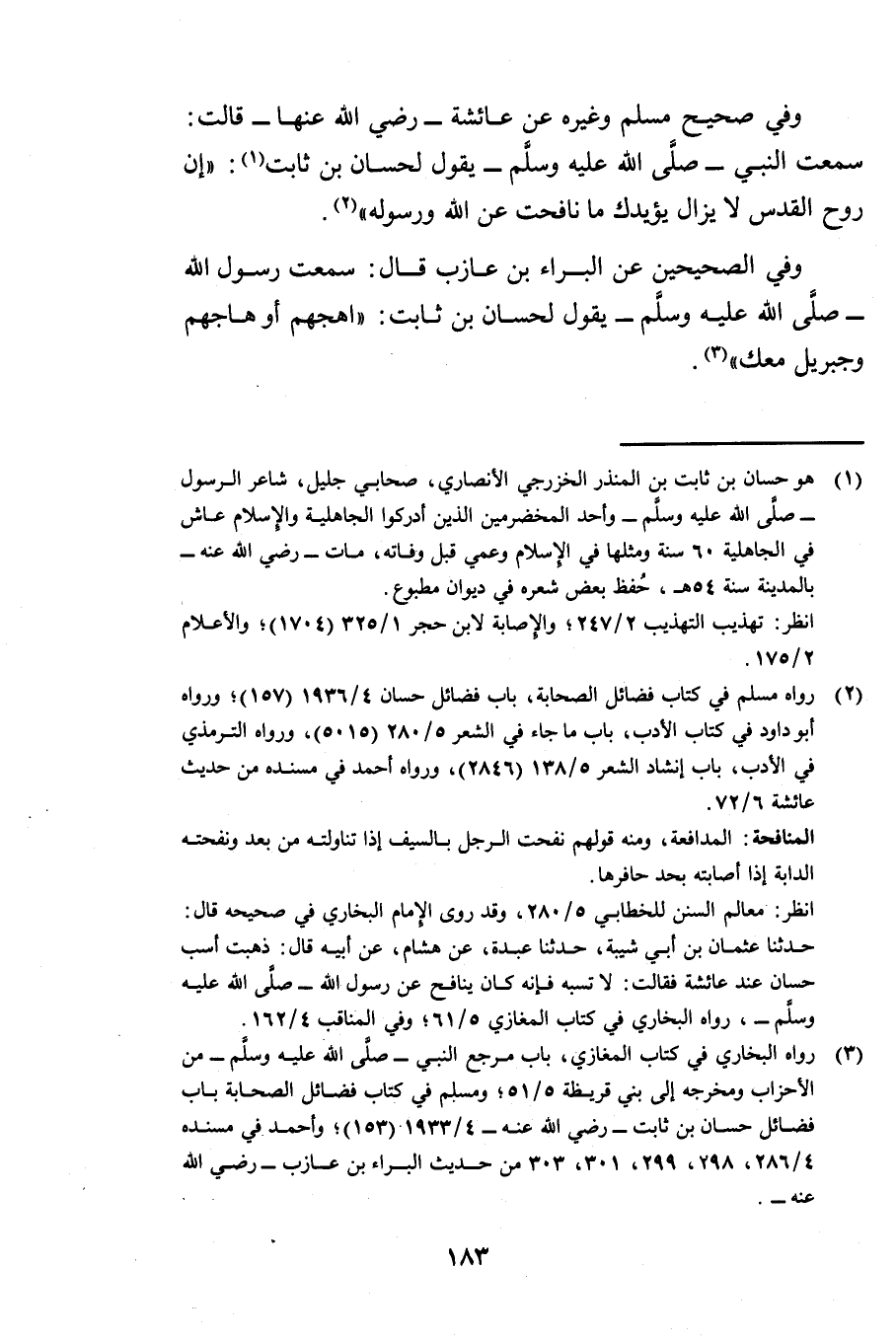 وَفِي الصَّحِيحَيْنِ عَنِ الْبَرَاءِ بْنِ عَازِبٍ قَالَ: «سَمِعْتُ رَسُولَ اللَّهِ - صَلَّى اللَّهُ عَلَيْهِ وَسَلَّمَ - يَقُولُ لِحَسَّانِ بْنِ ثَابِتٍ: " اهْجُهُمْ أَوْ هَاجِهِمْ وَجِبْرِيلُ مَعَكَ» .