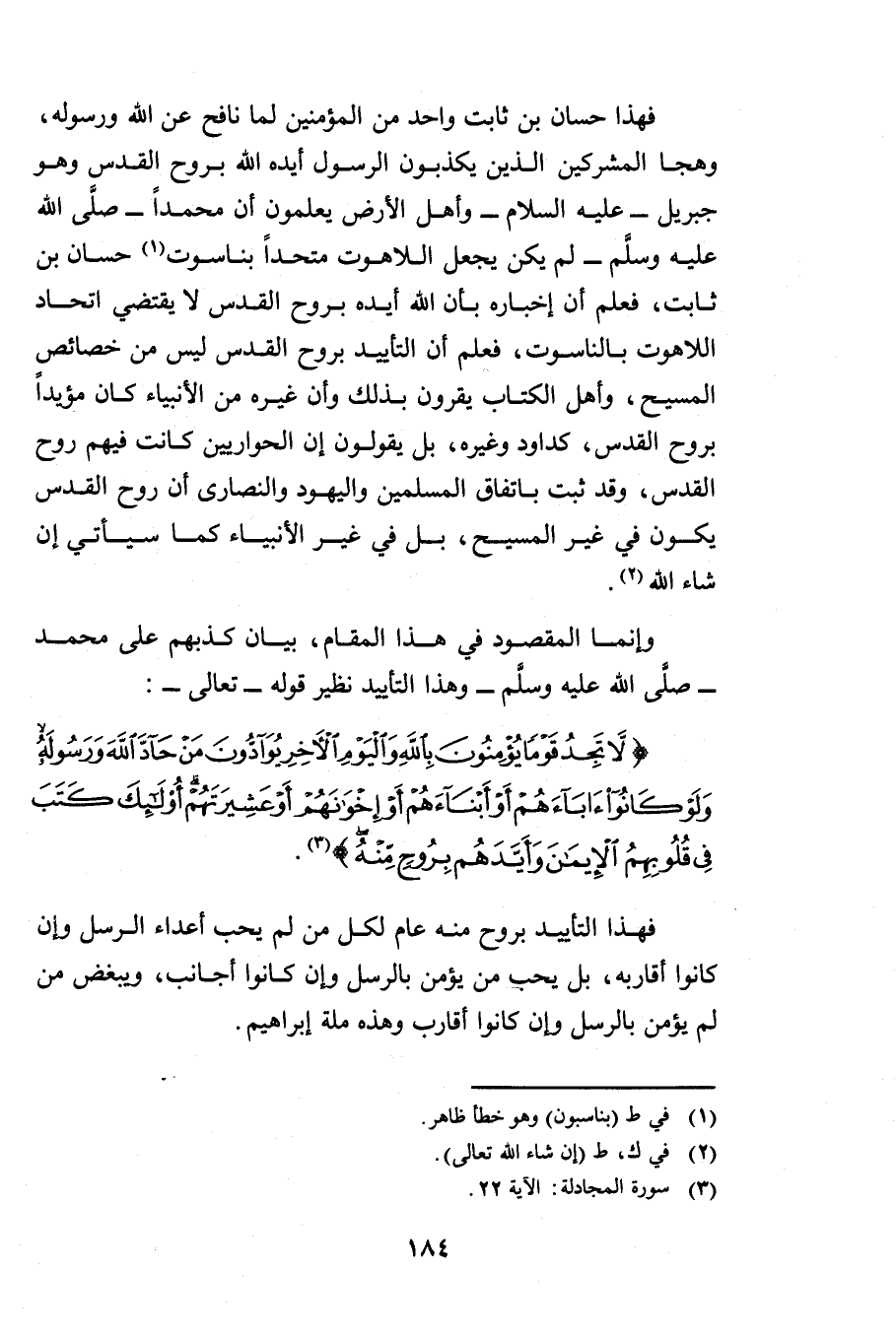 فَهَذَا حَسَّانُ بْنُ ثَابِتٍ وَاحِدٌ مِنَ الْمُؤْمِنِينَ لَمَّا نَافَحَ عَنِ اللَّهِ وَرَسُولِهِ وَهَجَا الْمُشْرِكِينَ الَّذِينَ يُكَذِّبُونَ الرَّسُولَ أَيَّدَهُ اللَّهُ بِرُوحِ الْقُدُسِ وَهُوَ جِبْرِيلُ - عَلَيْهِ السَّلَامُ - وَأَهْلُ الْأَرْضِ يَعْلَمُونَ أَنَّ مُحَمَّدًا - صَلَّى اللَّهُ عَلَيْهِ وَسَلَّمَ - لَمْ يَكُنْ يَجْعَلُ اللَّاهُوتَ مُتَّحِدًا بِنَاسُوتِ حَسَّانِ بْنِ ثَابِتٍ فَعُلِمَ أَنَّ إِخْبَارَهُ بِأَنَّ اللَّهَ أَيَّدَهُ بِرُوحِ الْقُدُسِ لَا يَقْتَضِي اتِّحَادَ اللَّاهُوتِ بِالنَّاسُوتِ فَعُلِمَ أَنَّ التَّأْيِيدَ بِرُوحِ الْقُدُسِ لَيْسَ مِنْ خَصَائِصِ الْمَسِيحِ وَأَهْلُ الْكِتَابِ يُقِرُّونَ بِذَلِكَ وَأَنَّ غَيْرَهُ مِنَ الْأَنْبِيَاءِ كَانَ مُؤَيَّدًا بِرُوحِ الْقُدُسِ كَدَاوُدَ وَغَيْرِهِ بَلْ يَقُولُونَ إِنَّ الْحَوَارِيِّينَ كَانَتْ فِيهِمْ رُوحُ الْقُدُسِ وَقَدْ ثَبَتَ بِاتِّفَاقِ الْمُسْلِمِينَ وَالْيَهُودِ وَالنَّصَارَى أَنَّ رُوحَ الْقُدُسِ يَكُونُ فِي غَيْرِ الْمَسِيحِ بَلْ فِي غَيْرِ الْأَنْبِيَاءِ كَمَا سَيَأْتِي - إِنْ شَاءَ اللَّهُ.