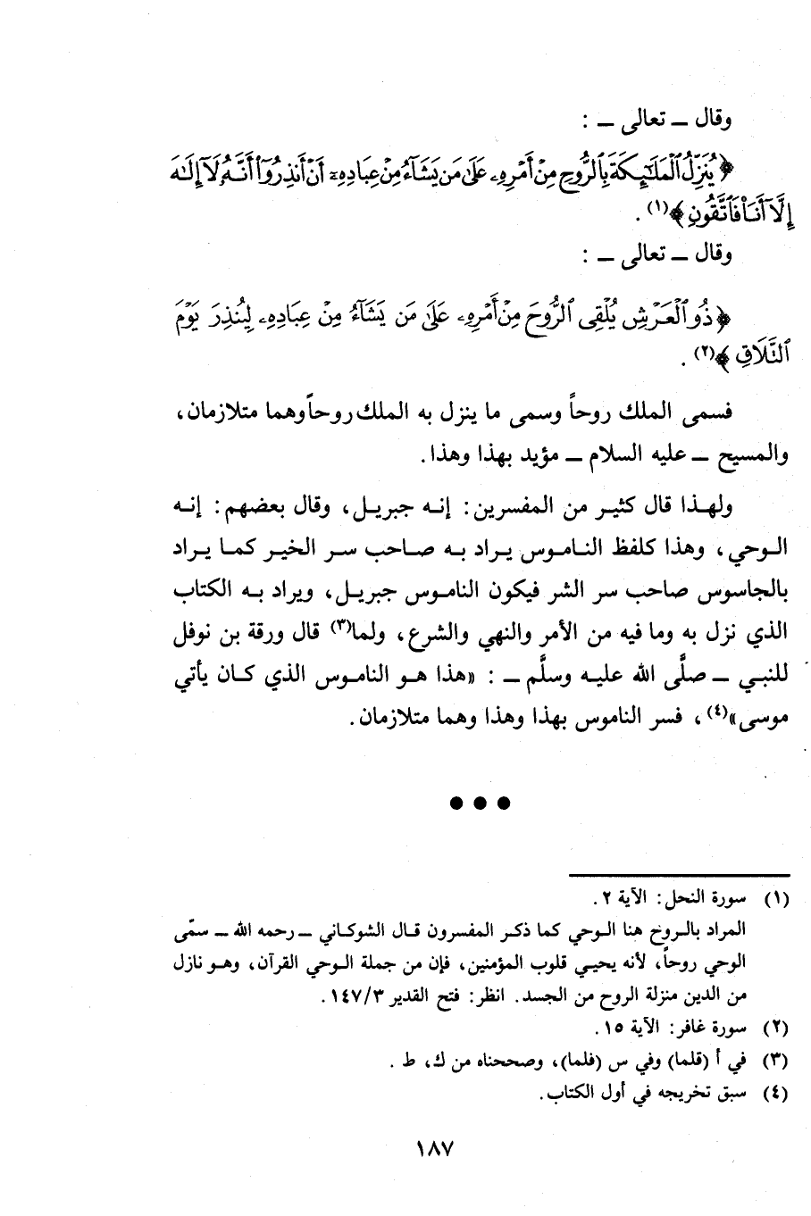 وَقَالَ - تَعَالَى -: {يُنَزِّلُ الْمَلَائِكَةَ بِالرُّوحِ مِنْ أَمْرِهِ عَلَى مَنْ يَشَاءُ مِنْ عِبَادِهِ أَنْ أَنْذِرُوا أَنَّهُ لَا إِلَهَ إِلَّا أَنَا فَاتَّقُونِ} [النحل: 2] وَقَالَ - تَعَالَى -: {ذُو الْعَرْشِ يُلْقِي الرُّوحَ مِنْ أَمْرِهِ عَلَى مَنْ يَشَاءُ مِنْ عِبَادِهِ لِيُنْذِرَ يَوْمَ التَّلَاقِ} [غافر: 15] فَسَمَّى الْمَلَكَ رُوحًا وَسَمَّى مَا يَنْزِلُ بِهِ الْمَلَكُ رُوحًا وَهُمَا مُتَلَازِمَانِ وَالْمَسِيحُ - عَلَيْهِ السَّلَامُ - مُؤَيَّدٌ بِهَذَا وَهَذَا.