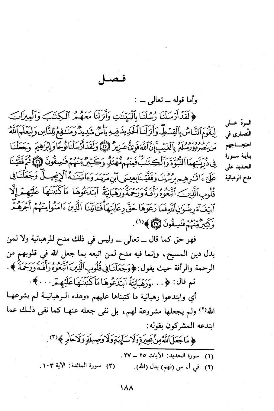 [فَصْلٌ: الرَّدُّ عَلَى النَّصَارَى فِي احْتِجَاجِهِمْ بِآيَةِ سُورَةِ الْحَدِيدِ عَلَى مَدْحِ الرَّهْبَانِيَّةِ]