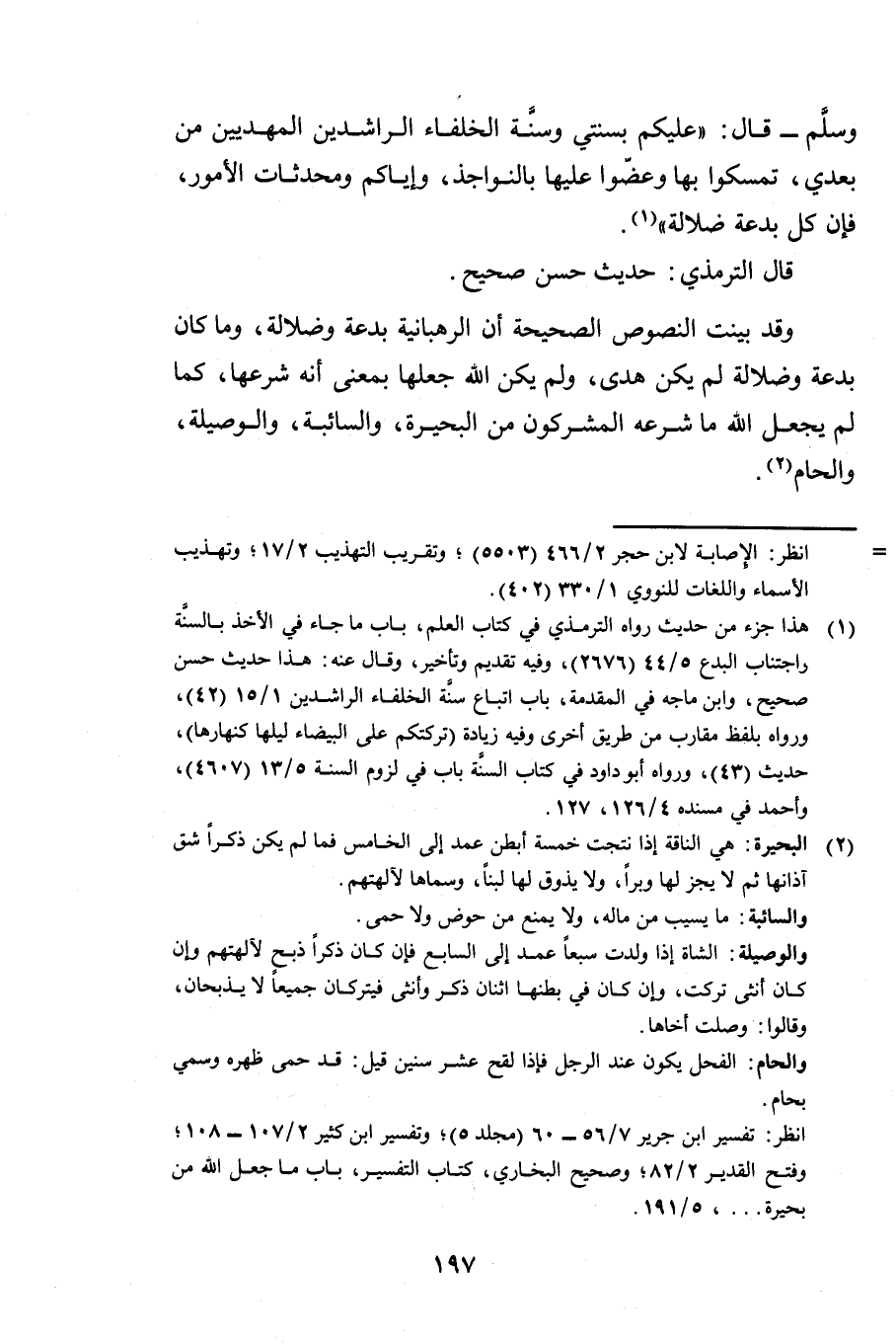 وَقَدْ بَيَّنَتِ النُّصُوصُ الصَّحِيحَةُ أَنَّ الرَّهْبَانِيَّةَ بِدْعَةٌ وَضَلَالَةٌ وَمَا كَانَ بِدْعَةً وَضَلَالَةً لَمْ يَكُنْ هُدًى وَلَمْ يَكُنِ اللَّهُ جَعَلَهَا بِمَعْنَى أَنَّهُ شَرَعَهَا كَمَا لَمْ يَجْعَلِ اللَّهُ مَا شَرَعَهُ الْمُشْرِكُونَ مِنَ الْبَحِيرَةِ وَالسَّائِبَةِ وَالْوَصِيلَةِ وَالْحَامِ.