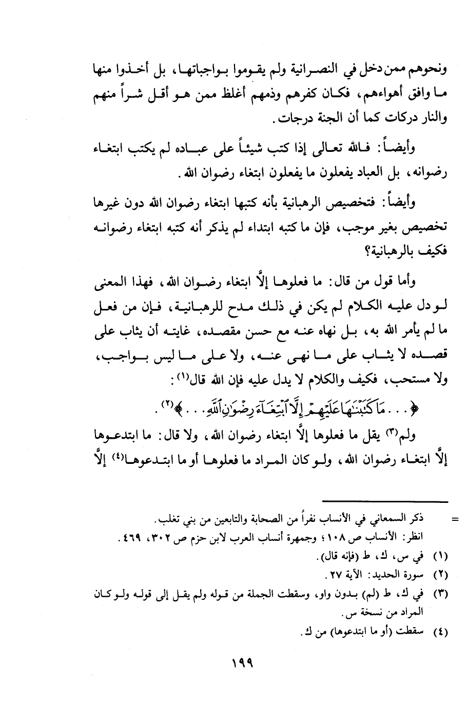 وَأَيْضًا فَتَخْصِيصُ الرَّهْبَانِيَّةِ بِأَنَّهُ كَتَبَهَا ابْتِغَاءَ رِضْوَانِ اللَّهِ دُونَ غَيْرِهَا تَخْصِيصٌ بِغَيْرِ مُوجِبٍ، فَإِنَّ مَا كَتَبَهُ ابْتِدَاءً لَمْ يَذْكُرْ أَنَّهُ كَتَبَهُ ابْتِغَاءَ رِضْوَانِهِ فَكَيْفَ بِالرَّهْبَانِيَّةِ؟ .