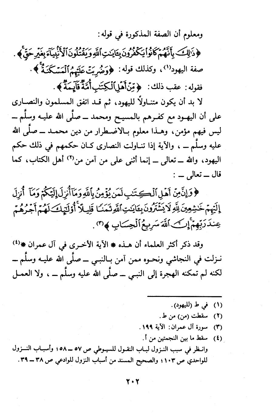 وَمَعْلُومٌ أَنَّ الصِّفَةَ الْمَذْكُورَةَ فِي قَوْلِهِ: {ذَلِكَ بِأَنَّهُمْ كَانُوا يَكْفُرُونَ بِآيَاتِ اللَّهِ وَيَقْتُلُونَ الْأَنْبِيَاءَ بِغَيْرِ حَقٍّ} [آل عمران: 112] صِفَةُ الْيَهُودِ وَكَذَلِكَ قَوْلُهُ: {وَضُرِبَتْ عَلَيْهِمُ الْمَسْكَنَةُ} [آل عمران: 112] فَقَوْلُهُ عَقِبَ ذَلِكَ {مِنْ أَهْلِ الْكِتَابِ أُمَّةٌ قَائِمَةٌ} [آل عمران: 113] لَا بُدَّ أَنْ يَكُونَ مُتَنَاوِلًا لِلْيَهُودِ ثُمَّ قَدِ اتَّفَقَ الْمُسْلِمُونَ وَالنَّصَارَى عَلَى أَنَّ الْيَهُودَ مَعَ كُفْرِهِمْ بِالْمَسِيحِ وَمُحَمَّدٍ - صَلَّى اللَّهُ عَلَيْهِ وَسَلَّمَ - لَيْسَ فِيهِمْ مُؤْمِنٌ وَهَذَا مَعْلُومٌ بِالِاضْطِرَارِ مِنْ دِينِ مُحَمَّدٍ - صَلَّى اللَّهُ عَلَيْهِ وَسَلَّمَ - وَالْآيَةُ إِذَا تَنَاوَلَتِ النَّصَارَى كَانَ حُكْمُهُمْ فِي ذَلِكَ حُكْمَ الْيَهُودِ وَاللَّهُ تَعَالَى إِنَّمَا أَثْنَى عَلَى مَنْ آمَنَ مِنْ أَهْلِ الْكِتَابِ كَمَا قَالَ - تَعَالَى -: {وَإِنَّ مِنْ أَهْلِ الْكِتَابِ لَمَنْ يُؤْمِنُ بِاللَّهِ وَمَا أُنْزِلَ إِلَيْكُمْ وَمَا أُنْزِلَ إِلَيْهِمْ خَاشِعِينَ لِلَّهِ لَا يَشْتَرُونَ بِآيَاتِ اللَّهِ ثَمَنًا قَلِيلًا أُولَئِكَ لَهُمْ أَجْرُهُمْ عِنْدَ رَبِّهِمْ إِنَّ اللَّهَ سَرِيعُ الْحِسَابِ} [آل عمران: 199] وَقَدْ ذَكَرَ أَكْثَرُ الْعُلَمَاءِ أَنَّ هَذِهِ الْآيَةَ الْأُخْرَى فِي آلِ عِمْرَانَ نَزَلَتْ فِي النَّجَاشِيِّ وَنَحْوِهِ مِمَّنْ آمَنَ بِالنَّبِيِّ - صَلَّى اللَّهُ عَلَيْهِ وَسَلَّمَ - لَكِنَّهُ لَمْ تُمْكِنْهُ الْهِجْرَةُ إِلَى النَّبِيِّ - صَلَّى اللَّهُ عَلَيْهِ وَسَلَّمَ - وَلَا الْعَمَلُ