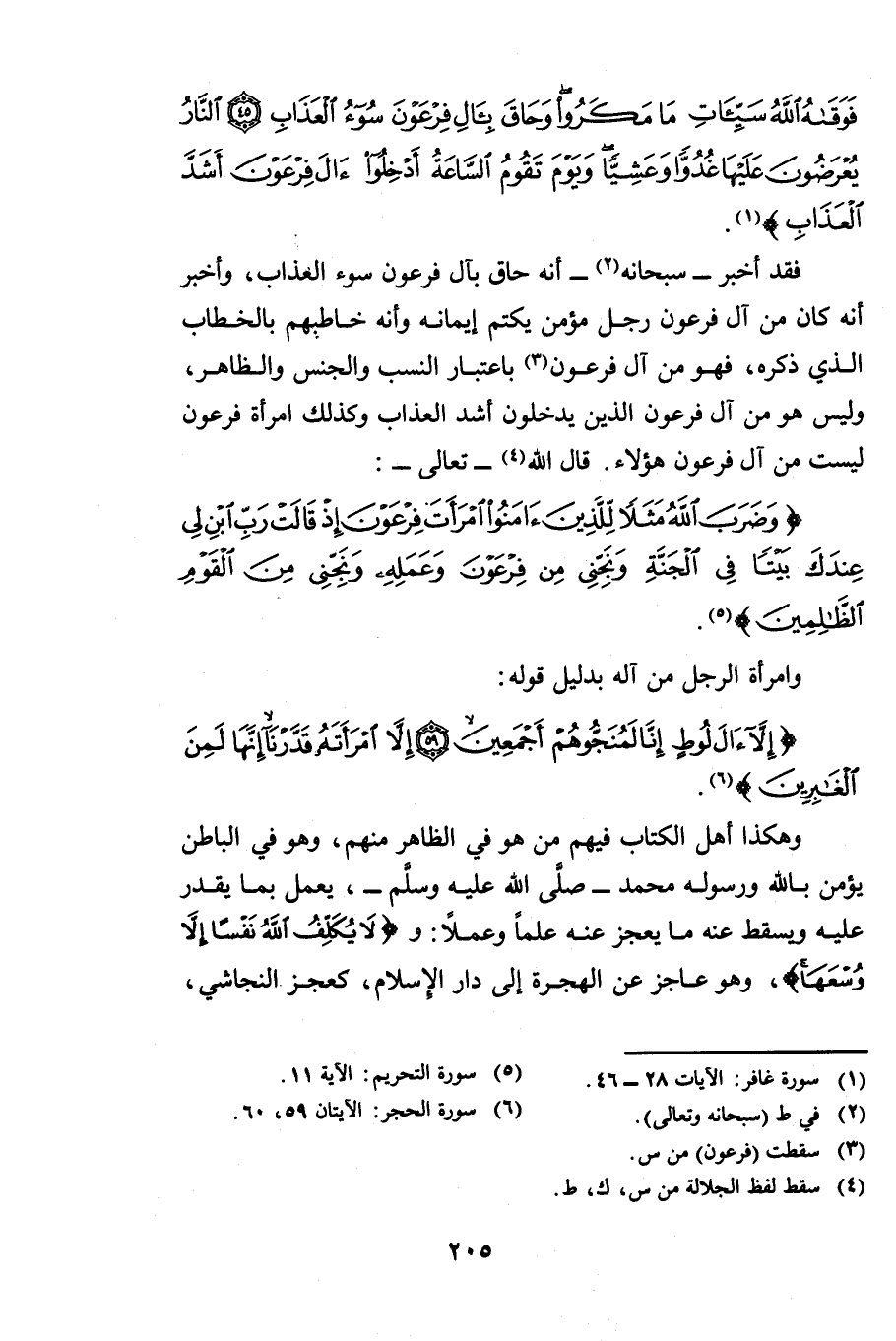 فَقَدْ أَخْبَرَ سُبْحَانَهُ أَنَّهُ حَاقَ بِآلِ فِرْعَوْنَ سُوءُ الْعَذَابِ وَأَخْبَرَ أَنَّهُ كَانَ مِنْ آلِ فِرْعَوْنَ رَجُلٌ مُؤْمِنٌ يَكْتُمُ إِيمَانَهُ وَأَنَّهُ خَاطَبَهُمْ بِالْخِطَابِ الَّذِي ذَكَرَهُ فَهُوَ مِنْ آلِ فِرْعَوْنَ بِاعْتِبَارِ النَّسَبِ وَالْجِنْسِ وَالظَّاهِرِ وَلَيْسَ هُوَ مِنْ آلِ فِرْعَوْنَ الَّذِينَ يَدْخُلُونَ أَشَدَّ الْعَذَابِ وَكَذَلِكَ امْرَأَةُ فِرْعَوْنَ لَيْسَتْ مِنْ آلِ فِرْعَوْنَ هَؤُلَاءِ قَالَ اللَّهُ تَعَالَى {وَضَرَبَ اللَّهُ مَثَلًا لِلَّذِينَ آمَنُوا اِمْرَأَةَ فِرْعَوْنَ إِذْ قَالَتْ رَبِّ ابْنِ لِي عِنْدَكَ بَيْتًا فِي الْجَنَّةِ وَنَجِّنِي مِنْ فِرْعَوْنَ وَعَمَلِهِ وَنَجِّنِي مِنَ الْقَوْمِ الظَّالِمِينَ} [التحريم: 11] وَامْرَأَةُ الرَّجُلِ مِنْ آلِهِ بِدَلِيلِ قَوْلِهِ: {إِلَّا آلَ لُوطٍ إِنَّا لَمُنَجُّوهُمْ أَجْمَعِينَ} [الحجر: 59] (59) {إِلَّا امْرَأَتَهُ قَدَّرْنَا إِنَّهَا لَمِنَ الْغَابِرِينَ} [الحجر: 60] وَهَكَذَا أَهْلُ الْكِتَابِ فِيهِمْ مَنْ هُوَ فِي الظَّاهِرِ مِنْهُمْ وَهُوَ فِي الْبَاطِنِ يُؤْمِنُ بِاللَّهِ وَرَسُولِهِ مُحَمَّدٍ - صَلَّى اللَّهُ عَلَيْهِ وَسَلَّمَ - يَعْمَلُ بِمَا يَقْدِرُ عَلَيْهِ وَيَسْقُطُ عَنْهُ مَا يَعْجِزُ عَنْهُ عِلْمًا وَعَمَلًا: وَ {لَا يُكَلِّفُ اللَّهُ نَفْسًا إِلَّا وُسْعَهَا} [البقرة: 286] وَهُوَ عَاجِزٌ عَنِ الْهِجْرَةِ إِلَى دَارِ الْإِسْلَامِ كَعَجْزِ النَّجَاشِيِّ.