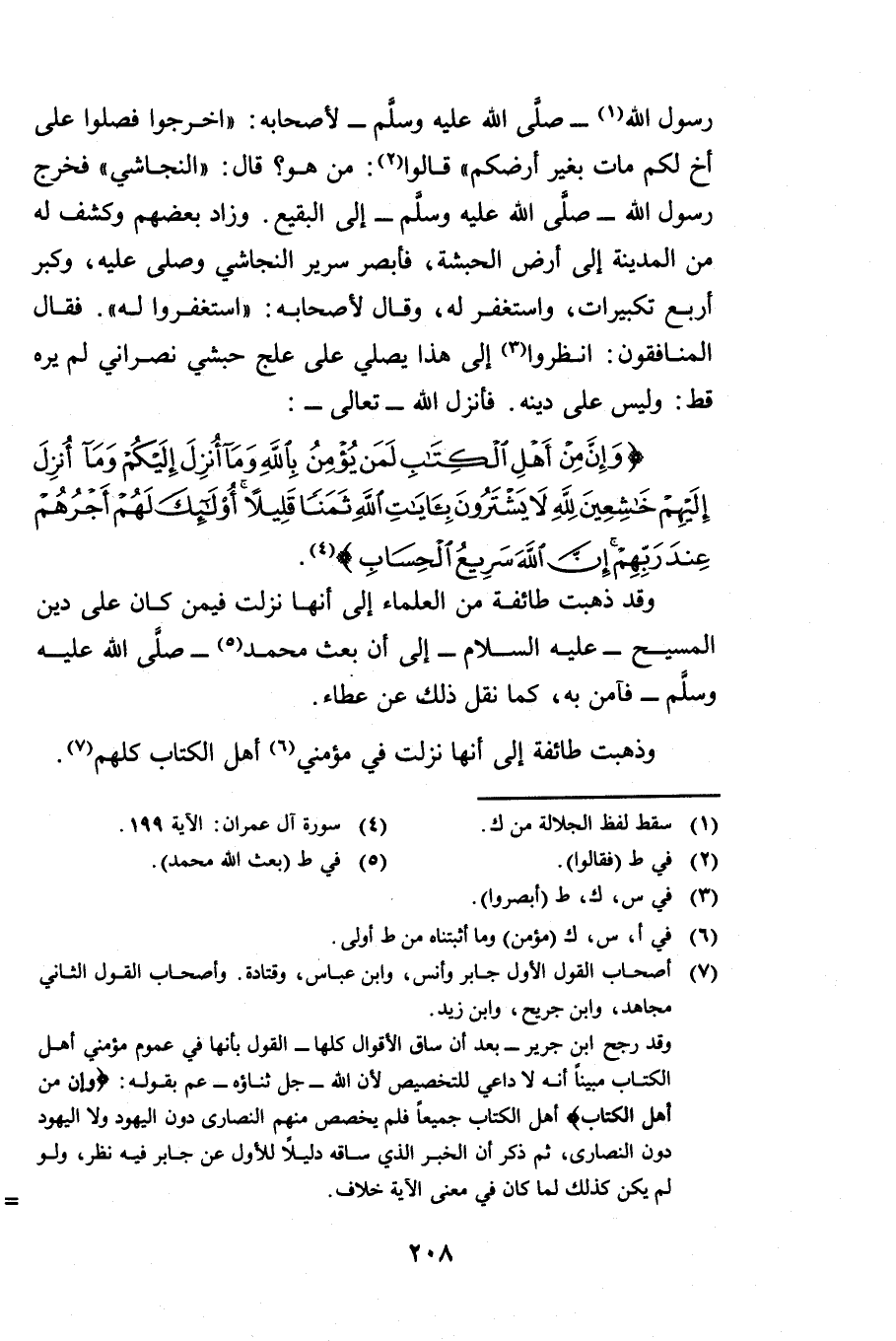 رَسُولُ اللَّهِ - صَلَّى اللَّهُ عَلَيْهِ وَسَلَّمَ - لِأَصْحَابِهِ اخْرُجُوا فَصَلُّوا عَلَى أَخٍ لَكُمْ مَاتَ بِغَيْرِ أَرْضِكُمْ قَالُوا: مَنْ هُوَ؟ قَالَ: النَّجَاشِيُّ فَخَرَجَ رَسُولُ اللَّهِ - صَلَّى اللَّهُ عَلَيْهِ وَسَلَّمَ - إِلَى الْبَقِيعِ وَزَادَ بَعْضُهُمْ: وَكُشِفَ لَهُ مِنَ الْمَدِينَةِ إِلَى أَرْضِ الْحَبَشَةِ فَأَبْصَرَ سَرِيرَ النَّجَاشِيِّ وَصَلَّى عَلَيْهِ وَكَبَّرَ أَرْبَعَ تَكْبِيرَاتٍ وَاسْتَغْفَرَ لَهُ وَقَالَ لِأَصْحَابِهِ: اسْتَغْفِرُوا لَهُ فَقَالَ الْمُنَافِقُونَ: انْظُرُوا إِلَى هَذَا يُصَلِّي عَلَى عِلْجٍ حَبَشِيٍّ نَصْرَانِيٍّ لَمْ يَرَهُ قَطُّ وَلَيْسَ عَلَى دِينِهِ، فَأَنْزَلَ اللَّهُ تَعَالَى {وَإِنَّ مِنْ أَهْلِ الْكِتَابِ لَمَنْ يُؤْمِنُ بِاللَّهِ وَمَا أُنْزِلَ إِلَيْكُمْ وَمَا أُنْزِلَ إِلَيْهِمْ خَاشِعِينَ لِلَّهِ لَا يَشْتَرُونَ بِآيَاتِ اللَّهِ ثَمَنًا قَلِيلًا أُولَئِكَ لَهُمْ أَجْرُهُمْ عِنْدَ رَبِّهِمْ إِنَّ اللَّهَ سَرِيعُ الْحِسَابِ} [آل عمران: 199] » وَقَدْ ذَهَبَتْ طَائِفَةٌ مِنَ الْعُلَمَاءِ إِلَى أَنَّهَا نَزَلَتْ فِيمَنْ كَانَ عَلَى دِينِ الْمَسِيحِ - عَلَيْهِ السَّلَامُ - إِلَى أَنْ بُعِثَ مُحَمَّدٌ - صَلَّى اللَّهُ عَلَيْهِ وَسَلَّمَ - فَآمَنَ بِهِ كَمَا نُقِلَ ذَلِكَ عَنْ عَطَاءٍ.