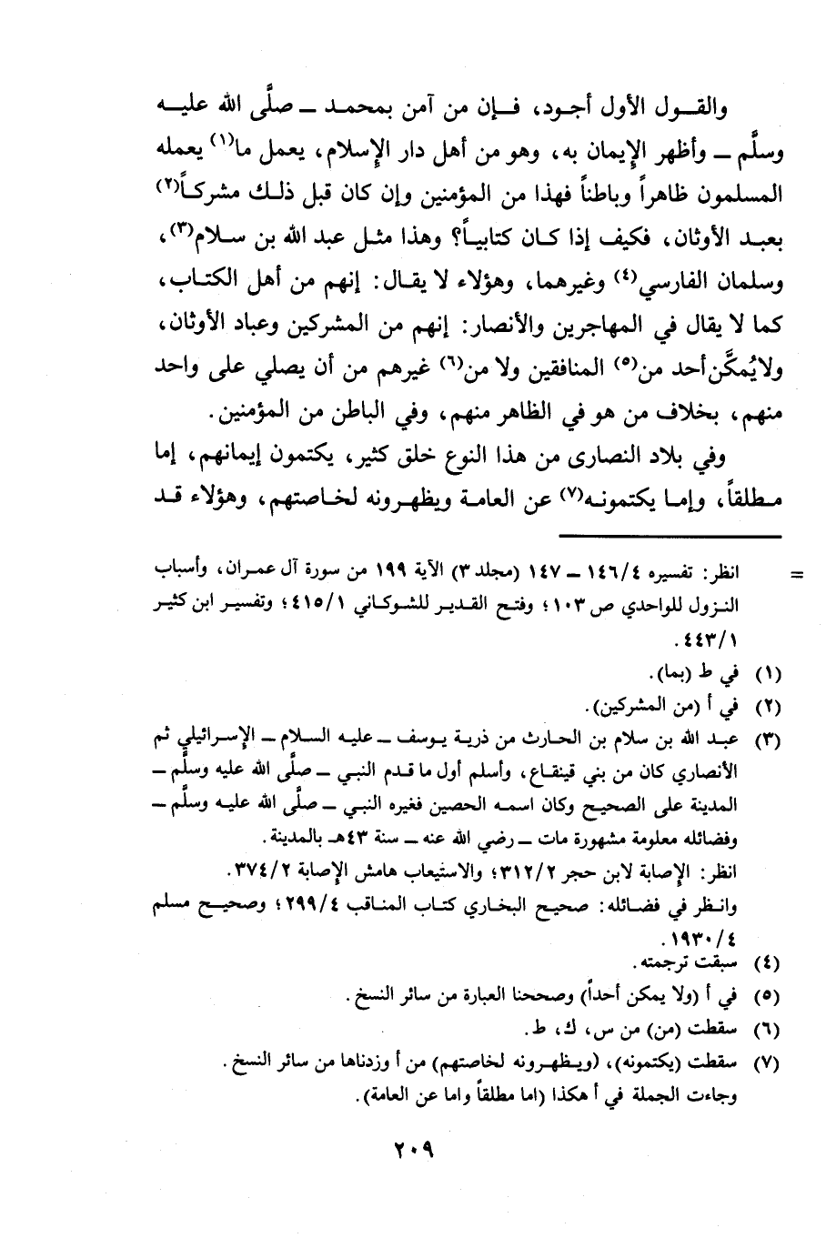 وَالْقَوْلُ الْأَوَّلُ أَجْوَدُ، فَإِنَّ مَنْ آمَنَ بِمُحَمَّدٍ - صَلَّى اللَّهُ عَلَيْهِ وَسَلَّمَ - وَأَظْهَرَ الْإِيمَانَ بِهِ وَهُوَ مِنْ أَهْلِ دَارِ الْإِسْلَامِ يَعْمَلُ مَا يَعْمَلُهُ الْمُسْلِمُونَ ظَاهِرًا وَبَاطِنًا فَهَذَا مِنَ الْمُؤْمِنِينَ وَإِنْ كَانَ قَبْلَ ذَلِكَ مُشْرِكًا يَعْبُدُ الْأَوْثَانَ فَكَيْفَ إِذَا كَانَ كِتَابِيًّا؟ وَهَذَا مِثْلُ عَبْدِ اللَّهِ بْنِ سَلَامٍ وَسَلْمَانَ الْفَارِسِيِّ وَغَيْرِهِمَا وَهَؤُلَاءِ لَا يُقَالُ أَنَّهُمْ مِنْ أَهْلِ الْكِتَابِ كَمَا لَا يُقَالُ فِي الْمُهَاجِرِينَ وَالْأَنْصَارِ أَنَّهُمْ مِنَ الْمُشْرِكِينَ وَعُبَّادِ الْأَوْثَانِ وَلَا يُمَكَّنُ أَحَدٌ مِنَ الْمُنَافِقِينَ وَلَا مِنْ غَيْرِهِمْ مِنْ أَنْ يُصَلِّيَ عَلَى وَاحِدٍ مِنْهُمْ بِخِلَافِ مَنْ هُوَ فِي الظَّاهِرِ مِنْهُمْ وَفِي الْبَاطِنِ مِنَ الْمُؤْمِنِينَ.