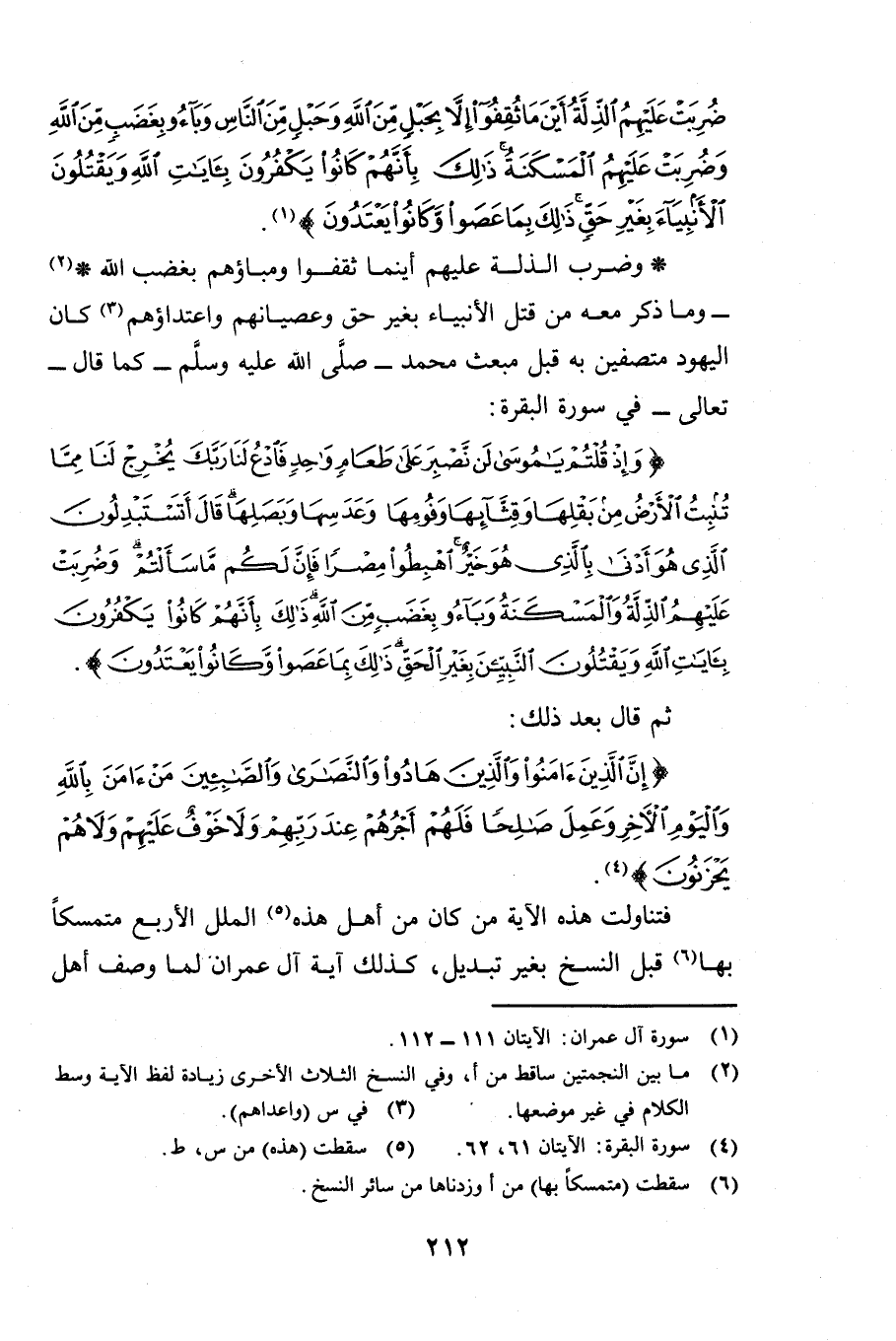 وَضَرْبُ الذِّلَّةِ عَلَيْهِمْ أَيْنَمَا ثُقِفُوا وَمُبَاؤُهُمْ بِغَضَبِ اللَّهِ وَمَا ذُكِرَ مَعَهُ مِنْ قَتْلِ الْأَنْبِيَاءِ بِغَيْرِ حَقٍّ وَعِصْيَانُهُمْ وَاعْتِدَاؤُهُمْ كَانَ الْيَهُودُ مُتَّصِفِينَ بِهِ قَبْلَ مَبْعَثِ مُحَمَّدٍ - صَلَّى اللَّهُ عَلَيْهِ وَسَلَّمَ - كَمَا قَالَ - تَعَالَى - فِي سُورَةِ الْبَقَرَةِ {وَإِذْ قُلْتُمْ يَامُوسَى لَنْ نَصْبِرَ عَلَى طَعَامٍ وَاحِدٍ فَادْعُ لَنَا رَبَّكَ يُخْرِجْ لَنَا مِمَّا تُنْبِتُ الْأَرْضُ مِنْ بَقْلِهَا وَقِثَّائِهَا وَفُومِهَا وَعَدَسِهَا وَبَصَلِهَا قَالَ أَتَسْتَبْدِلُونَ الَّذِي هُوَ أَدْنَى بِالَّذِي هُوَ خَيْرٌ اهْبِطُوا مِصْرًا فَإِنَّ لَكُمْ مَا سَأَلْتُمْ وَضُرِبَتْ عَلَيْهِمُ الذِّلَّةُ وَالْمَسْكَنَةُ وَبَاءُوا بِغَضَبٍ مِنَ اللَّهِ ذَلِكَ بِأَنَّهُمْ كَانُوا يَكْفُرُونَ بِآيَاتِ اللَّهِ وَيَقْتُلُونَ النَّبِيِّينَ بِغَيْرِ الْحَقِّ ذَلِكَ بِمَا عَصَوْا وَكَانُوا يَعْتَدُونَ} [البقرة: 61] ثُمَّ قَالَ بَعْدَ ذَلِكَ {إِنَّ الَّذِينَ آمَنُوا وَالَّذِينَ هَادُوا وَالنَّصَارَى وَالصَّابِئِينَ مَنْ آمَنَ بِاللَّهِ وَالْيَوْمِ الْآخِرِ وَعَمِلَ صَالِحًا فَلَهُمْ أَجْرُهُمْ عِنْدَ رَبِّهِمْ وَلَا خَوْفٌ عَلَيْهِمْ وَلَا هُمْ يَحْزَنُونَ} [البقرة: 62] فَتَنَاوَلَتْ هَذِهِ الْآيَةُ مَنْ كَانَ مِنْ أَهْلِ هَذِهِ الْمِلَلِ الْأَرْبَعِ مُتَمَسِّكًا بِهَا قَبْلَ النَّسْخِ بِغَيْرِ تَبْدِيلٍ كَذَلِكَ آيَةُ آلِ عِمْرَانَ لَمَّا وُصِفَ أَهْلُ