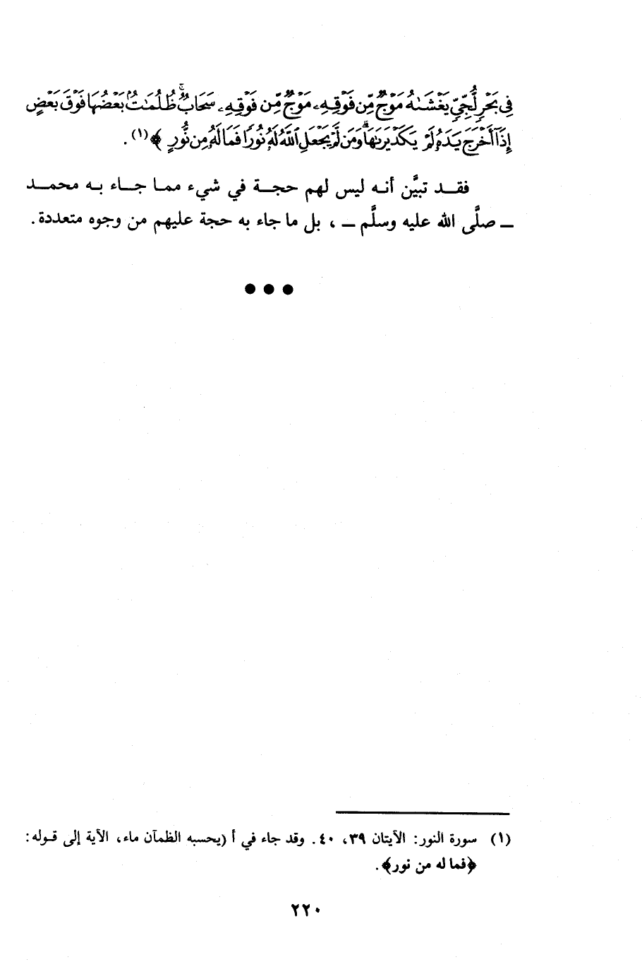 {وَالَّذِينَ كَفَرُوا أَعْمَالُهُمْ كَسَرَابٍ بِقِيعَةٍ يَحْسَبُهُ الظَّمْآنُ مَاءً حَتَّى إِذَا جَاءَهُ لَمْ يَجِدْهُ شَيْئًا وَوَجَدَ اللَّهَ عِنْدَهُ فَوَفَّاهُ حِسَابَهُ وَاللَّهُ سَرِيعُ الْحِسَابِ} [النور: 39] (39) {أَوْ كَظُلُمَاتٍ فِي بَحْرٍ لُجِّيٍّ يَغْشَاهُ مَوْجٌ مِنْ فَوْقِهِ مَوْجٌ مِنْ فَوْقِهِ سَحَابٌ ظُلُمَاتٌ بَعْضُهَا فَوْقَ بَعْضٍ إِذَا أَخْرَجَ يَدَهُ لَمْ يَكَدْ يَرَاهَا وَمَنْ لَمْ يَجْعَلِ اللَّهُ لَهُ نُورًا فَمَا لَهُ مِنْ نُورٍ} [النور: 40] فَقَدْ تَبَيَّنَ أَنَّهُ لَيْسَ لَهُمْ حُجَّةٌ فِي شَيْءٍ مِمَّا جَاءَ بِهِ مُحَمَّدٌ - صَلَّى اللَّهُ عَلَيْهِ وَسَلَّمَ - بَلْ مَا جَاءَ بِهِ حُجَّةٌ عَلَيْهِمْ مِنْ وُجُوهٍ مُتَعَدِّدَةٍ.