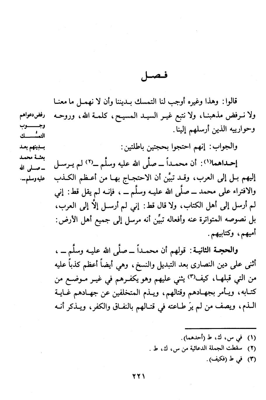 إِحْدَاهُمَا: أَنَّ مُحَمَّدًا - صَلَّى اللَّهُ عَلَيْهِ وَسَلَّمَ - لَمْ يُرْسَلْ إِلَيْهِمْ بَلْ إِلَى الْعَرَبِ وَقَدْ تَبَيَّنَ أَنَّ الِاحْتِجَاجَ بِهَا مِنْ أَعْظَمِ الْكَذِبِ وَالِافْتِرَاءِ عَلَى مُحَمَّدٍ - صَلَّى اللَّهُ عَلَيْهِ وَسَلَّمَ - فَإِنَّهُ لَمْ يَقُلْ قَطُّ إِنِّي لَمْ أُرْسَلْ إِلَى أَهْلِ الْكِتَابِ وَلَا قَالَ قَطُّ إِنِّي لَمْ أُرْسَلْ إِلَّا إِلَى الْعَرَبِ بَلْ نُصُوصُهُ الْمُتَوَاتِرَةُ عَنْهُ وَأَفْعَالُهُ تُبَيِّنُ أَنَّهُ مُرْسَلٌ إِلَى جَمِيعِ أَهْلِ الْأَرْضِ أُمِّيِّهِمْ وَكِتَابِيِّهِمْ.
