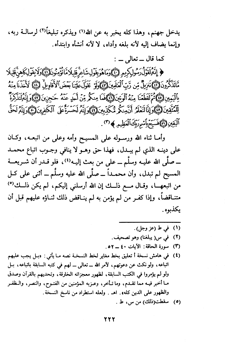 كَمَا قَالَ - تَعَالَى -: {إِنَّهُ لَقَوْلُ رَسُولٍ كَرِيمٍ} [الحاقة: 40] (40) {وَمَا هُوَ بِقَوْلِ شَاعِرٍ قَلِيلًا مَا تُؤْمِنُونَ} [الحاقة: 41] (41) {وَلَا بِقَوْلِ كَاهِنٍ قَلِيلًا مَا تَذَكَّرُونَ} [الحاقة: 42] (42) {تَنْزِيلٌ مِنْ رَبِّ الْعَالَمِينَ} [الحاقة: 43] (43) {وَلَوْ تَقَوَّلَ عَلَيْنَا بَعْضَ الْأَقَاوِيلِ} [الحاقة: 44] (44) {لَأَخَذْنَا مِنْهُ بِالْيَمِينِ} [الحاقة: 45] (45) {ثُمَّ لَقَطَعْنَا مِنْهُ الْوَتِينَ} [الحاقة: 46] (46) {فَمَا مِنْكُمْ مِنْ أَحَدٍ عَنْهُ حَاجِزِينَ} [الحاقة: 47] (47) {وَإِنَّهُ لَتَذْكِرَةٌ لِلْمُتَّقِينَ} [الحاقة: 48] (48) {وَإِنَّا لَنَعْلَمُ أَنَّ مِنْكُمْ مُكَذِّبِينَ} [الحاقة: 49] (49) {وَإِنَّهُ لَحَسْرَةٌ عَلَى الْكَافِرِينَ} [الحاقة: 50] (50) {وَإِنَّهُ لَحَقُّ الْيَقِينِ} [الحاقة: 51] (51) {فَسَبِّحْ بِاسْمِ رَبِّكَ الْعَظِيمِ} [الحاقة: 52] وَأَمَّا ثَنَاءُ اللَّهِ وَرَسُولِهِ عَلَى الْمَسِيحِ وَأُمِّهِ وَعَلَى مَنِ اتَّبَعَهُ وَكَانَ عَلَى دِينِهِ الَّذِي لَمْ يُبَدَّلْ فَهَذَا حَقٌّ وَهُوَ لَا يُنَافِي وُجُوبَ اتِّبَاعِ مُحَمَّدٍ - صَلَّى اللَّهُ عَلَيْهِ وَسَلَّمَ - عَلَى مَنْ بُعِثَ إِلَيْهِ فَلَوْ قُدِّرَ أَنَّ شَرِيعَةَ الْمَسِيحِ لَمْ تُبَدَّلْ وَأَنَّ مُحَمَّدًا - صَلَّى اللَّهُ عَلَيْهِ وَسَلَّمَ - أَثْنَى عَلَى كُلِّ مَنِ اتَّبَعَهَا وَقَالَ مَعَ ذَلِكَ إِنَّ اللَّهَ أَرْسَلَنِي إِلَيْكُمْ لَمْ يَكُنْ ذَلِكَ مُتَنَاقِضًا وَإِذَا كَفَرَ مَنْ لَمْ يُؤْمِنْ بِهِ لَمْ يُنَاقِضْ ذَلِكَ ثَنَاؤُهُ عَلَيْهِمْ قَبْلَ أَنْ يُكَذِّبُوهُ.