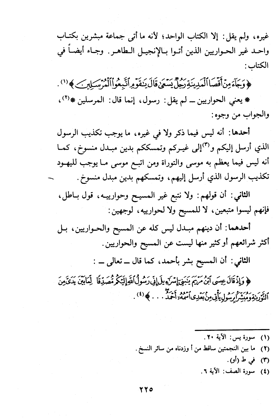 غَيْرِهِ وَلَمْ يَقُلْ إِلَّا الْكِتَابَ الْوَاحِدَ ; لِأَنَّهُ مَا أَتَى جَمَاعَةٌ مُبَشِّرِينَ بِكِتَابٍ وَاحِدٍ غَيْرَ الْحَوَارِيِّينَ الَّذِينَ أَتَوْا بِالْإِنْجِيلِ الطَّاهِرِ وَجَاءَ أَيْضًا فِي الْكِتَابِ {وَجَاءَ مِنْ أَقْصَى الْمَدِينَةِ رَجُلٌ يَسْعَى قَالَ يَاقَوْمِ اتَّبِعُوا الْمُرْسَلِينَ} [يس: 20] يَعْنِي الْحَوَارِيِّينَ لَمْ يَقُلْ رَسُولٌ إِنَّمَا قَالَ: الْمُرْسَلِينَ وَالْجَوَابُ مِنْ وُجُوهٍ: