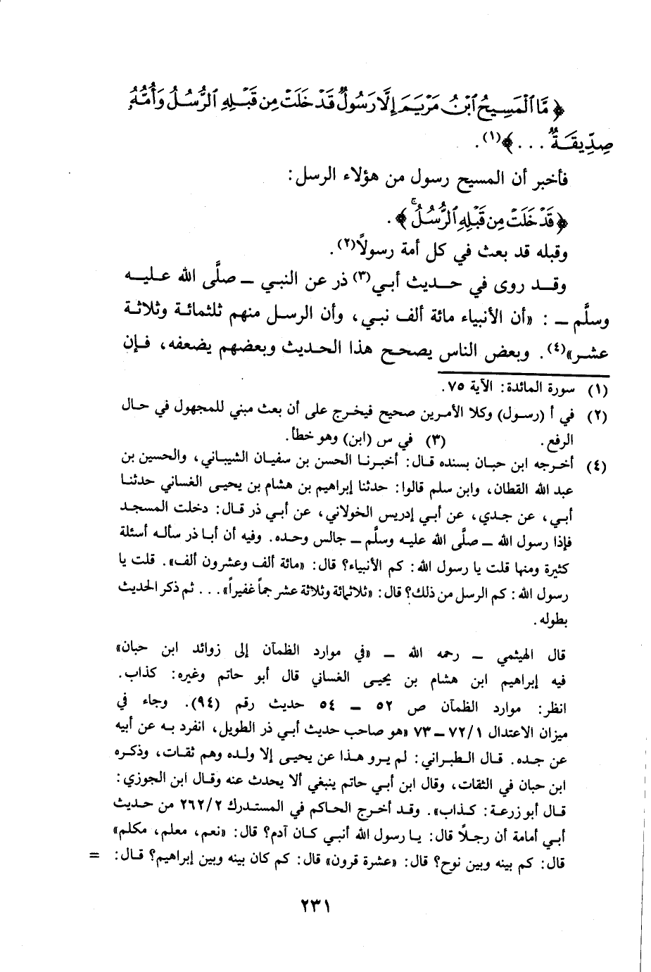 {مَا الْمَسِيحُ ابْنُ مَرْيَمَ إِلَّا رَسُولٌ قَدْ خَلَتْ مِنْ قَبْلِهِ الرُّسُلُ وَأُمُّهُ صِدِّيقَةٌ} [المائدة: 75] . . . فَأَخْبَرَ أَنَّ الْمَسِيحَ رَسُولٌ مِنْ هَؤُلَاءِ الرُّسُلِ {قَدْ خَلَتْ مِنْ قَبْلِهِ الرُّسُلُ} [المائدة: 75] وَقَبْلَهُ قَدْ بَعَثَ فِي كُلِّ أُمَّةٍ رَسُولًا.