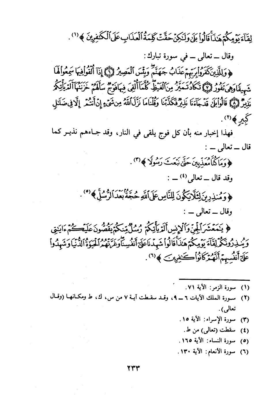 وَقَالَ - تَعَالَى - فِي سُورَةِ تَبَارَكَ: {وَلِلَّذِينَ كَفَرُوا بِرَبِّهِمْ عَذَابُ جَهَنَّمَ وَبِئْسَ الْمَصِيرُ - إِذَا أُلْقُوا فِيهَا سَمِعُوا لَهَا شَهِيقًا وَهِيَ تَفُورُ - تَكَادُ تَمَيَّزُ مِنَ الْغَيْظِ كُلَّمَا أُلْقِيَ فِيهَا فَوْجٌ سَأَلَهُمْ خَزَنَتُهَا أَلَمْ يَأْتِكُمْ نَذِيرٌ - قَالُوا بَلَى قَدْ جَاءَنَا نَذِيرٌ فَكَذَّبْنَا وَقُلْنَا مَا نَزَّلَ اللَّهُ مِنْ شَيْءٍ إِنْ أَنْتُمْ إِلَّا فِي ضَلَالٍ كَبِيرٍ} [الملك: 6 - 9] فَهَذَا إِخْبَارٌ مِنْهُ بِأَنَّ كُلَّ فَوْجٍ يُلْقَى فِي النَّارِ وَقَدْ جَاءَهُمْ نَذِيرٌ ; كَمَا قَالَ - تَعَالَى -: {وَمَا كُنَّا مُعَذِّبِينَ حَتَّى نَبْعَثَ رَسُولًا} [الإسراء: 15] وَقَدْ قَالَ - تَعَالَى -: {وَمُنْذِرِينَ لِئَلَّا يَكُونَ لِلنَّاسِ عَلَى اللَّهِ حُجَّةٌ بَعْدَ الرُّسُلِ} [النساء: 165] وَقَالَ - تَعَالَى -: {يَامَعْشَرَ الْجِنِّ وَالْإِنْسِ أَلَمْ يَأْتِكُمْ رُسُلٌ مِنْكُمْ يَقُصُّونَ عَلَيْكُمْ آيَاتِي وَيُنْذِرُونَكُمْ لِقَاءَ يَوْمِكُمْ هَذَا قَالُوا شَهِدْنَا عَلَى أَنْفُسِنَا وَغَرَّتْهُمُ الْحَيَاةُ الدُّنْيَا وَشَهِدُوا عَلَى أَنْفُسِهِمْ أَنَّهُمْ كَانُوا كَافِرِينَ} [الأنعام: 130] .
