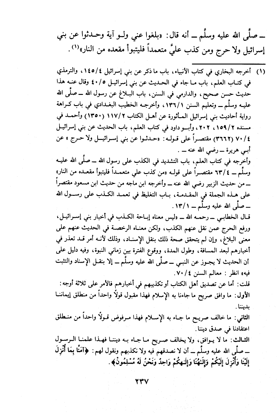 - صَلَّى اللَّهُ عَلَيْهِ وَسَلَّمَ - أَنَّهُ قَالَ: «بَلِّغُوا عَنِّي وَلَوْ آيَةً وَحَدِّثُوا عَنْ بَنِي إِسْرَائِيلَ وَلَا حَرَجَ وَمَنْ كَذَبَ عَلَيَّ مُتَعَمِّدًا فَلْيَتَبَوَّأْ مَقْعَدَهُ مِنَ النَّارِ» .