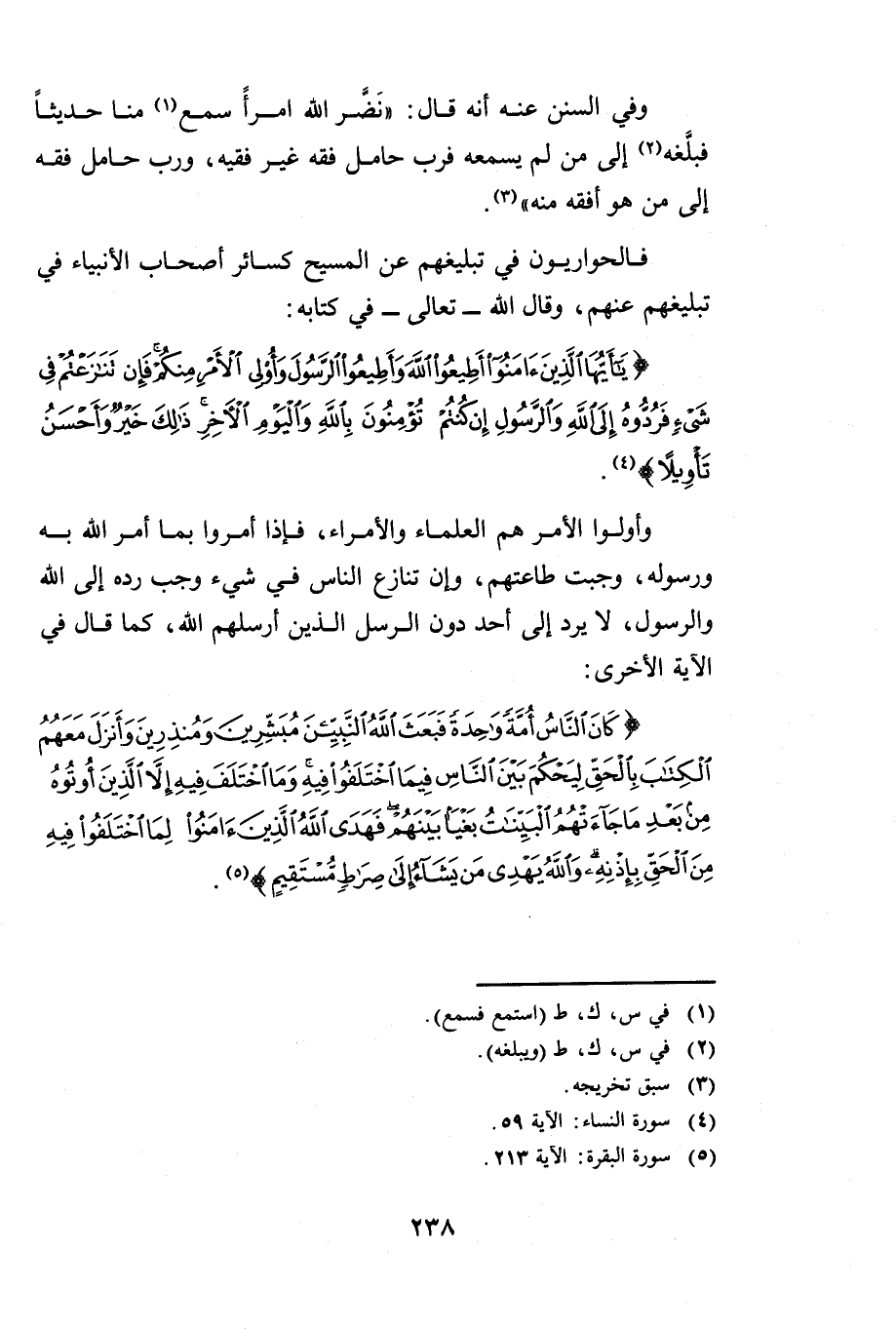 فَالْحَوَارِيُّونَ فِي تَبْلِيغِهِمْ عَنِ الْمَسِيحِ كَسَائِرِ أَصْحَابِ الْأَنْبِيَاءِ فِي تَبْلِيغِهِمْ عَنْهُمْ وَقَالَ اللَّهُ تَعَالَى فِي كِتَابِهِ: {يَاأَيُّهَا الَّذِينَ آمَنُوا أَطِيعُوا اللَّهَ وَأَطِيعُوا الرَّسُولَ وَأُولِي الْأَمْرِ مِنْكُمْ فَإِنْ تَنَازَعْتُمْ فِي شَيْءٍ فَرُدُّوهُ إِلَى اللَّهِ وَالرَّسُولِ إِنْ كُنْتُمْ تُؤْمِنُونَ بِاللَّهِ وَالْيَوْمِ الْآخِرِ ذَلِكَ خَيْرٌ وَأَحْسَنُ تَأْوِيلًا} [النساء: 59] وَأُولُوا الْأَمْرِ هُمُ الْعُلَمَاءُ وَالْأُمَرَاءُ فَإِذَا أَمَرُوا بِمَا أَمَرَ اللَّهُ بِهِ وَرَسُولُهُ وَجَبَتْ طَاعَتُهُمْ وَإِنْ تَنَازَعَ النَّاسُ فِي شَيْءٍ وَجَبَ رَدُّهُ إِلَى اللَّهِ وَالرَّسُولِ - صَلَّى اللَّهُ عَلَيْهِ وَسَلَّمَ - لَا يُرَدُّ إِلَى أَحَدٍ دُونَ الرُّسُلِ الَّذِينَ أَرْسَلَهُمُ اللَّهُ ; كَمَا قَالَ: فِي الْآيَةِ الْأُخْرَى {كَانَ النَّاسُ أُمَّةً وَاحِدَةً فَبَعَثَ اللَّهُ النَّبِيِّينَ مُبَشِّرِينَ وَمُنْذِرِينَ وَأَنْزَلَ مَعَهُمُ الْكِتَابَ بِالْحَقِّ لِيَحْكُمَ بَيْنَ النَّاسِ فِيمَا اخْتَلَفُوا فِيهِ وَمَا اخْتَلَفَ فِيهِ إِلَّا الَّذِينَ أُوتُوهُ مِنْ بَعْدِ مَا جَاءَتْهُمُ الْبَيِّنَاتُ بَغْيًا بَيْنَهُمْ فَهَدَى اللَّهُ الَّذِينَ آمَنُوا لِمَا اخْتَلَفُوا فِيهِ مِنَ الْحَقِّ بِإِذْنِهِ وَاللَّهُ يَهْدِي مَنْ يَشَاءُ إِلَى صِرَاطٍ مُسْتَقِيمٍ} [البقرة: 213] .