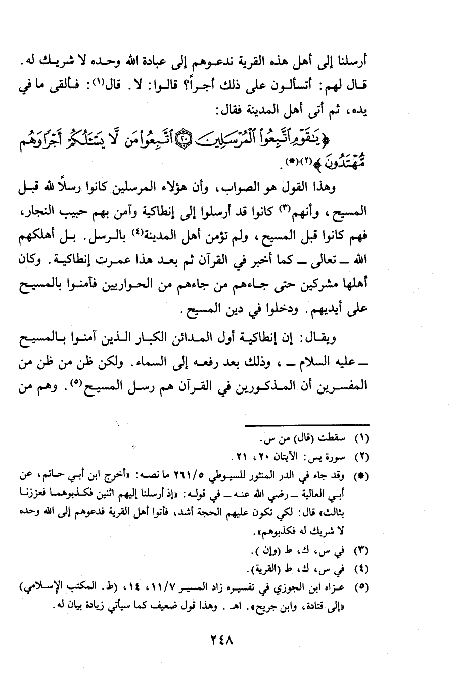 أُرْسِلْنَا إِلَى أَهْلِ هَذِهِ الْقَرْيَةِ نَدْعُوهُمْ إِلَى عِبَادَةِ اللَّهِ وَحْدَهُ لَا شَرِيكَ لَهُ قَالَ لَهُمْ: أَتَسْأَلُونَ عَلَى ذَلِكَ أَجْرًا؟ قَالُوا: لَا، قَالَ: فَأَلْقَى مَا فِي يَدِهِ ثُمَّ أَتَى أَهْلَ الْمَدِينَةِ {قَالَ يَاقَوْمِ اتَّبِعُوا الْمُرْسَلِينَ اتَّبِعُوا مَنْ لَا يَسْأَلُكُمْ أَجْرًا وَهُمْ مُهْتَدُونَ} [يس: 20] وَهَذَا الْقَوْلُ هُوَ الصَّوَابُ وَأَنَّ هَؤُلَاءِ الْمُرْسَلِينَ كَانُوا رُسُلًا لِلَّهِ قَبْلَ الْمَسِيحِ وَأَنَّهُمْ كَانُوا قَدْ أُرْسِلُوا إِلَى أَنْطَاكِيَةَ وَآمَنَ بِهِمْ حَبِيبٌ النَّجَّارُ فَهُمْ كَانُوا قَبْلَ الْمَسِيحِ وَلَمْ تُؤْمِنْ أَهْلُ الْمَدِينَةِ بِالرُّسُلِ بَلْ أَهْلَكَهُمُ اللَّهُ تَعَالَى ; كَمَا أَخْبَرَ فِي الْقُرْآنِ ثُمَّ بَعْدَ هَذَا عُمِّرَتْ أَنْطَاكِيَةُ وَكَانَ أَهْلُهَا مُشْرِكِينَ حَتَّى جَاءَهُمْ مَنْ جَاءَهُمْ مِنَ الْحَوَارِيِّينَ فَآمَنُوا بِالْمَسِيحِ عَلَى أَيْدِيهِمْ وَدَخَلُوا دِينَ الْمَسِيحِ.
