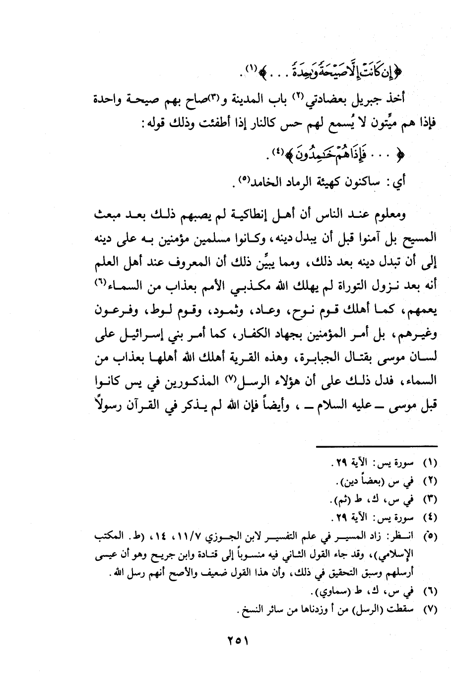 {إِنْ كَانَتْ إِلَّا صَيْحَةً وَاحِدَةً} [يس: 29] أَخَذَ جِبْرِيلُ بِعِضَادَتَيْ بَابِ الْمَدِينَةِ وَصَاحَ بِهِمْ صَيْحَةً وَاحِدَةً فَإِذَا هُمْ مَيِّتُونَ لَا يُسْمَعُ لَهُمْ حِسٌّ كَالنَّارِ إِذَا أُطْفِئَتْ وَذَلِكَ قَوْلُهُ: {فَإِذَا هُمْ خَامِدُونَ} [يس: 29] أَيْ سَاكِنُونَ كَهَيْئَةِ الرَّمَادِ الْخَامِدِ.