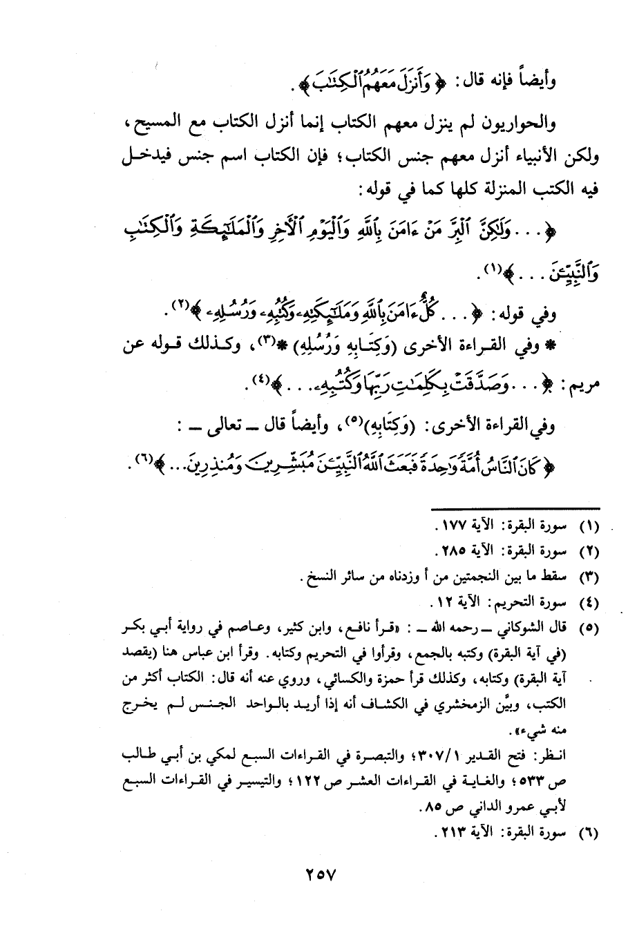 وَالْحَوَارِيُّونَ لَمْ يَنْزِلْ مَعَهُمُ الْكِتَابُ إِنَّمَا أُنْزِلَ الْكِتَابُ مَعَ الْمَسِيحِ، وَلَكِنَّ الْأَنْبِيَاءَ أُنْزِلَ مَعَهُمْ جِنْسُ الْكِتَابِ، فَإِنَّ الْكِتَابَ اسْمُ جِنْسٍ فَيَدْخُلُ فِيهِ الْكُتُبُ الْمُنَزَّلَةُ كُلُّهَا ; كَمَا فِي قَوْلِهِ: {وَلَكِنَّ الْبِرَّ مَنْ آمَنَ بِاللَّهِ وَالْيَوْمِ الْآخِرِ وَالْمَلَائِكَةِ وَالْكِتَابِ وَالنَّبِيِّينَ} [البقرة: 177] وَفِي قَوْلِهِ: {كُلٌّ آمَنَ بِاللَّهِ وَمَلَائِكَتِهِ وَكُتُبِهِ وَرُسُلِهِ} [البقرة: 285] وَفِي الْقِرَاءَةِ الْأُخْرَى (وَكِتَابِهِ وَرُسُلِهِ) وَكَذَلِكَ قَوْلُهُ عَنْ مَرْيَمَ: {وَصَدَّقَتْ بِكَلِمَاتِ رَبِّهَا وَكُتُبِهِ} [التحريم: 12] وَفِي الْقِرَاءَةِ الْأُخْرَى (وَكِتَابِهِ) وَأَيْضًا قَالَ - تَعَالَى -: {كَانَ النَّاسُ أُمَّةً وَاحِدَةً فَبَعَثَ اللَّهُ النَّبِيِّينَ مُبَشِّرِينَ وَمُنْذِرِينَ} [البقرة: 213] .