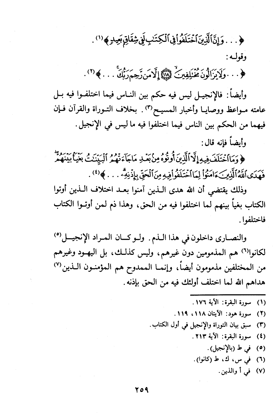 {وَإِنَّ الَّذِينَ اخْتَلَفُوا فِي الْكِتَابِ لَفِي شِقَاقٍ بَعِيدٍ} [البقرة: 176] وَقَوْلِهِ: {وَلَا يَزَالُونَ مُخْتَلِفِينَ إِلَّا مَنْ رَحِمَ رَبُّكَ} [هود: 118] وَأَيْضًا: فَالْإِنْجِيلُ لَيْسَ فِيهِ حُكْمٌ بَيْنَ النَّاسِ فِيمَا اخْتَلَفُوا فِيهِ بَلْ عَامَّتُهُ مَوَاعِظُ وَوَصَايَا وَأَخْبَارُ الْمَسِيحِ بِخِلَافِ التَّوْرَاةِ وَالْقُرْآنِ، فَإِنَّ فِيهِمَا مِنَ الْحُكْمِ بَيْنَ النَّاسِ فِيمَا اخْتَلَفُوا فِيهِ مَا لَيْسَ فِي الْإِنْجِيلِ.