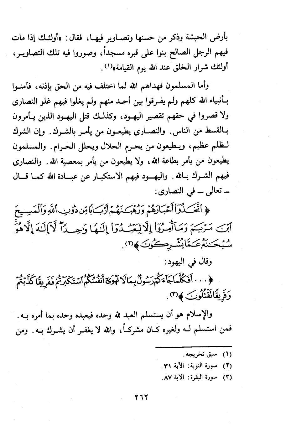 وَأَمَّا الْمُسْلِمُونَ فَهَدَاهُمُ اللَّهُ لِمَا اخْتُلِفَ فِيهِ مِنَ الْحَقِّ بِإِذْنِهِ فَآمَنُوا بِأَنْبِيَاءِ اللَّهِ كُلِّهِمْ وَلَمْ يُفَرِّقُوا بَيْنَ أَحَدٍ مِنْهُمْ وَلَمْ يَغْلُوا فِيهِمْ غُلُوَّ النَّصَارَى وَلَا قَصَّرُوا فِي حَقِّهِمْ تَقْصِيرَ الْيَهُودِ وَكَذَلِكَ قَتَلَ الْيَهُودُ الَّذِينَ يَأْمُرُونَ بِالْقِسْطِ مِنَ النَّاسِ وَالنَّصَارَى يُطِيعُونَ مَنْ يَأْمُرُ بِالشِّرْكِ وَإِنَّ الشِّرْكَ لَظُلْمٌ عَظِيمٌ وَيُطِيعُونَ مَنْ يُحَرِّمُ الْحَلَالَ وَيُحَلِّلُ الْحَرَامَ وَالْمُسْلِمُونَ يُطِيعُونَ مَنْ يَأْمُرُ بِطَاعَةِ اللَّهِ وَلَا يُطِيعُونَ مَنْ يَأْمُرُ بِمَعْصِيَةِ اللَّهِ. وَالنَّصَارَى فِيهِمُ الشِّرْكُ بِاللَّهِ وَالْيَهُودُ فِيهِمْ الِاسْتِكْبَارُ عَنْ عِبَادَةِ اللَّهِ ; كَمَا قَالَ - تَعَالَى -: فِي النَّصَارَى {اتَّخَذُوا أَحْبَارَهُمْ وَرُهْبَانَهُمْ أَرْبَابًا مِنْ دُونِ اللَّهِ وَالْمَسِيحَ ابْنَ مَرْيَمَ وَمَا أُمِرُوا إِلَّا لِيَعْبُدُوا إِلَهًا وَاحِدًا لَا إِلَهَ إِلَّا هُوَ سُبْحَانَهُ عَمَّا يُشْرِكُونَ} [التوبة: 31] وَقَالَ: فِي الْيَهُودِ {أَفَكُلَّمَا جَاءَكُمْ رَسُولٌ بِمَا لَا تَهْوَى أَنْفُسُكُمُ اسْتَكْبَرْتُمْ فَفَرِيقًا كَذَّبْتُمْ وَفَرِيقًا تَقْتُلُونَ} [البقرة: 87] وَالْإِسْلَامُ هُوَ أَنْ يَسْتَسْلِمَ الْعَبْدُ لِلَّهِ وَحْدَهُ فَيَعْبُدُهُ وَحْدَهُ بِمَا أَمَرَهُ بِهِ فَمَنِ اسْتَسْلَمَ لَهُ وَلِغَيْرِهِ كَانَ مُشْرِكًا، وَاللَّهُ لَا يَغْفِرُ أَنْ يُشْرَكَ بِهِ. وَمَنْ