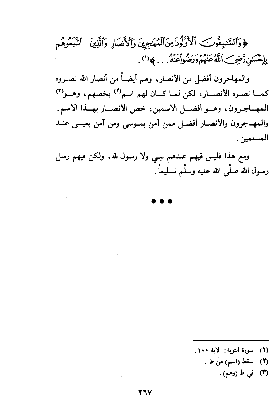 {وَالسَّابِقُونَ الْأَوَّلُونَ مِنَ الْمُهَاجِرِينَ وَالْأَنْصَارِ وَالَّذِينَ اتَّبَعُوهُمْ بِإِحْسَانٍ رَضِيَ اللَّهُ عَنْهُمْ وَرَضُوا عَنْهُ} [التوبة: 100] وَالْمُهَاجِرُونَ أَفْضَلُ مِنَ الْأَنْصَارِ وَهُمْ أَيْضًا مِنْ أَنْصَارِ اللَّهِ نَصَرُوهُ ; كَمَا نَصَرَهُ الْأَنْصَارُ لَكِنْ لَمَّا كَانَ لَهُمُ اسْمٌ يَخُصُّهُمْ وَهُوَ الْمُهَاجِرُونَ وَهُوَ أَفْضَلُ الِاسْمَيْنِ، خُصَّ الْأَنْصَارُ بِهَذَا الِاسْمِ. وَالْمُهَاجِرُونَ وَالْأَنْصَارُ أَفْضَلُ مِمَّنْ آمَنَ بِمُوسَى وَمَنْ آمَنَ بِعِيسَى عِنْدَ الْمُسْلِمِينَ.