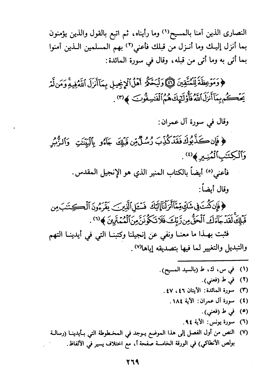 النَّصَارَى الَّذِينَ آمَنَّا بِالْمَسِيحِ وَمَا رَأَيْنَاهُ، ثُمَّ اتَّبَعَ بِالْقَوْلِ {وَالَّذِينَ يُؤْمِنُونَ بِمَا أُنْزِلَ إِلَيْكَ وَمَا أُنْزِلَ مِنْ قَبْلِكَ} [البقرة: 4] فَأَعْنِي بِهِمُ الْمُسْلِمِينَ الَّذِينَ آمَنُوا بِمَا آتَى بِهِ وَمَا أَتَى مِنْ قَبْلِهِ وَقَالَ: فِي سُورَةِ الْمَائِدَةِ {وَمَوْعِظَةً لِلْمُتَّقِينَ - وَلْيَحْكُمْ أَهْلُ الْإِنْجِيلِ بِمَا أَنْزَلَ اللَّهُ فِيهِ وَمَنْ لَمْ يَحْكُمْ بِمَا أَنْزَلَ اللَّهُ فَأُولَئِكَ هُمُ الْفَاسِقُونَ} [المائدة: 46 - 47] وَقَالَ فِي سُورَةِ آلِ عِمْرَانَ: {فَإِنْ كَذَّبُوكَ فَقَدْ كُذِّبَ رُسُلٌ مِنْ قَبْلِكَ جَاءُوا بِالْبَيِّنَاتِ وَالزُّبُرِ وَالْكِتَابِ الْمُنِيرِ} [آل عمران: 184] فَأَعْنِي أَيْضًا بِالْكِتَابِ الْمُنِيرِ الَّذِي هُوَ الْإِنْجِيلُ الْمُقَدَّسُ.