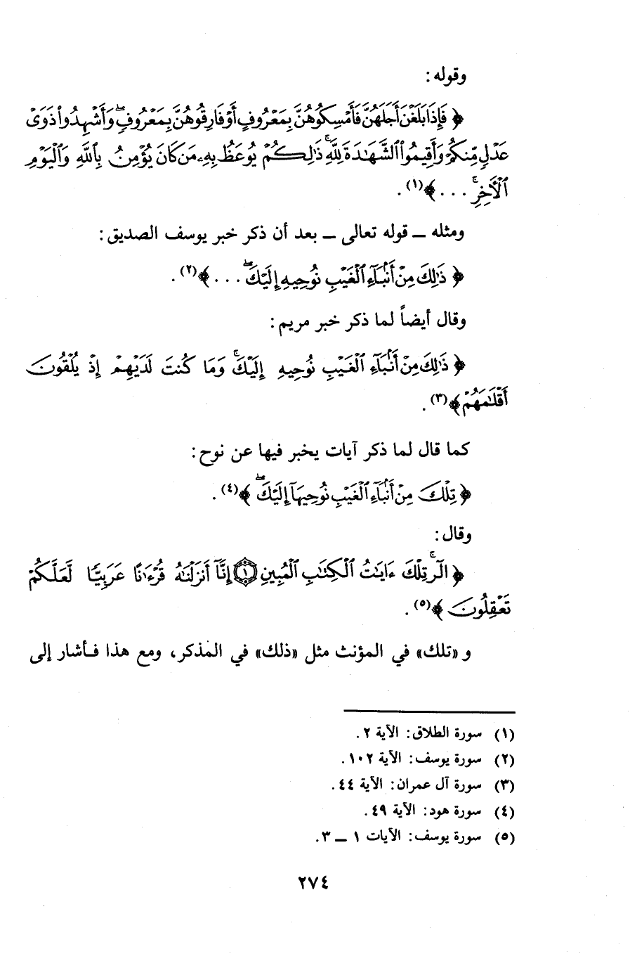 وَقَوْلِهِ: {فَإِذَا بَلَغْنَ أَجَلَهُنَّ فَأَمْسِكُوهُنَّ بِمَعْرُوفٍ أَوْ فَارِقُوهُنَّ بِمَعْرُوفٍ وَأَشْهِدُوا ذَوَيْ عَدْلٍ مِنْكُمْ وَأَقِيمُوا الشَّهَادَةَ لِلَّهِ ذَلِكُمْ يُوعَظُ بِهِ مَنْ كَانَ يُؤْمِنُ بِاللَّهِ وَالْيَوْمِ الْآخِرِ} [الطلاق: 2] وَمِثْلُهُ قَوْلُهُ - تَعَالَى -: بَعْدَ أَنْ ذَكَرَ خَبَرَ يُوسُفَ الصِّدِّيقَ {ذَلِكَ مِنْ أَنْبَاءِ الْغَيْبِ نُوحِيهِ إِلَيْكَ} [يوسف: 102] وَقَالَ أَيْضًا: لَمَّا ذَكَرَ خَبَرَ مَرْيَمَ: {ذَلِكَ مِنْ أَنْبَاءِ الْغَيْبِ نُوحِيهِ إِلَيْكَ وَمَا كُنْتَ لَدَيْهِمْ إِذْ يُلْقُونَ أَقْلَامَهُمْ} [آل عمران: 44] ; كَمَا قَالَ: لَمَّا ذَكَرَ آيَاتٍ يُخْبِرُ فِيهَا عَنْ نُوحٍ {تِلْكَ مِنْ أَنْبَاءِ الْغَيْبِ نُوحِيهَا إِلَيْكَ} [هود: 49] وَقَالَ: {الر - تِلْكَ آيَاتُ الْكِتَابِ الْمُبِينِ - إِنَّا أَنْزَلْنَاهُ قُرْآنًا عَرَبِيًّا لَعَلَّكُمْ تَعْقِلُونَ} [يوسف: 1 - 2] وَتِلْكَ فِي الْمُؤَنَّثِ مِثْلُ ذَلِكَ فِي الْمُذَكَّرِ وَمَعَ هَذَا فَأَشَارَ إِلَى