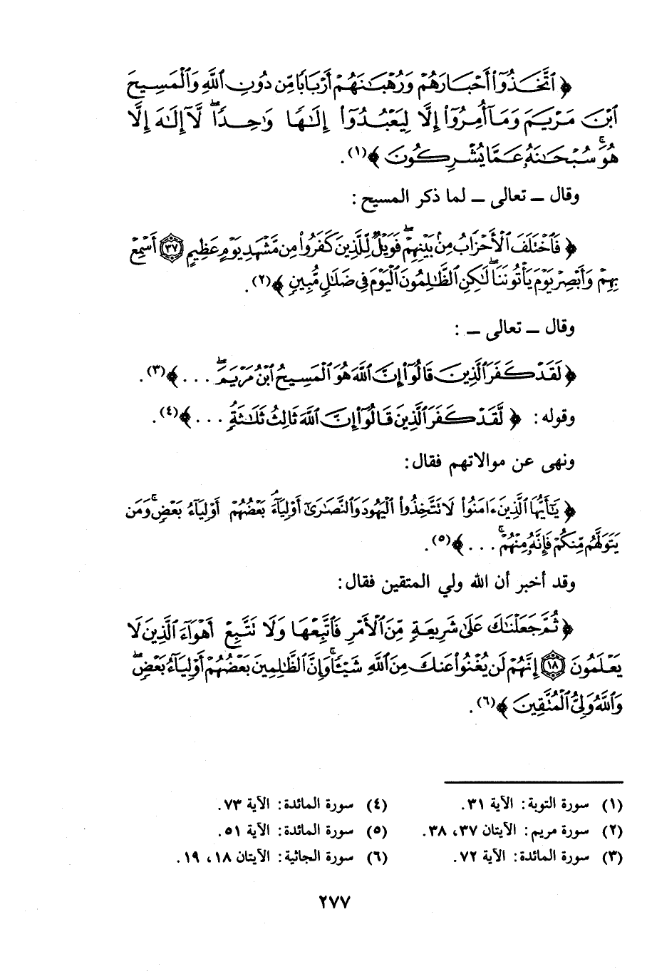 {اتَّخَذُوا أَحْبَارَهُمْ وَرُهْبَانَهُمْ أَرْبَابًا مِنْ دُونِ اللَّهِ وَالْمَسِيحَ ابْنَ مَرْيَمَ وَمَا أُمِرُوا إِلَّا لِيَعْبُدُوا إِلَهًا وَاحِدًا لَا إِلَهَ إِلَّا هُوَ سُبْحَانَهُ عَمَّا يُشْرِكُونَ} [التوبة: 31] وَقَالَ - تَعَالَى -: لَمَّا ذَكَرَ الْمَسِيحَ {فَاخْتَلَفَ الْأَحْزَابُ مِنْ بَيْنِهِمْ فَوَيْلٌ لِلَّذِينَ كَفَرُوا مِنْ مَشْهَدِ يَوْمٍ عَظِيمٍ - أَسْمِعْ بِهِمْ وَأَبْصِرْ يَوْمَ يَأْتُونَنَا لَكِنِ الظَّالِمُونَ الْيَوْمَ فِي ضَلَالٍ مُبِينٍ} [مريم: 37 - 38] وَقَالَ - تَعَالَى -: {لَقَدْ كَفَرَ الَّذِينَ قَالُوا إِنَّ اللَّهَ هُوَ الْمَسِيحُ ابْنُ مَرْيَمَ} [المائدة: 72] وَقَوْلُهُ: {لَقَدْ كَفَرَ الَّذِينَ قَالُوا إِنَّ اللَّهَ ثَالِثُ ثَلَاثَةٍ} [المائدة: 73] وَنَهَى عَنْ مُوَالَاتِهِمْ فَقَالَ {يَاأَيُّهَا الَّذِينَ آمَنُوا لَا تَتَّخِذُوا الْيَهُودَ وَالنَّصَارَى أَوْلِيَاءَ بَعْضُهُمْ أَوْلِيَاءُ بَعْضٍ وَمَنْ يَتَوَلَّهُمْ مِنْكُمْ فَإِنَّهُ مِنْهُمْ} [المائدة: 51] وَقَدْ أَخْبَرَ أَنَّ اللَّهَ وَلِيُّ الْمُتَّقِينَ فَقَالَ {ثُمَّ جَعَلْنَاكَ عَلَى شَرِيعَةٍ مِنَ الْأَمْرِ فَاتَّبِعْهَا وَلَا تَتَّبِعْ أَهْوَاءَ الَّذِينَ لَا يَعْلَمُونَ - إِنَّهُمْ لَنْ يُغْنُوا عَنْكَ مِنَ اللَّهِ شَيْئًا وَإِنَّ الظَّالِمِينَ بَعْضُهُمْ أَوْلِيَاءُ بَعْضٍ وَاللَّهُ وَلِيُّ الْمُتَّقِينَ} [الجاثية: 18 - 19]