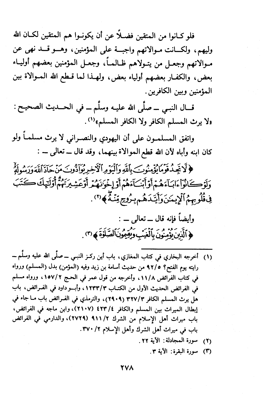 وَاتَّفَقَ الْمُسْلِمُونَ عَلَى أَنَّ الْيَهُودِيَّ وَالنَّصْرَانِيَّ لَا يَرِثُ مُسْلِمًا وَلَوْ كَانَ ابْنَهُ وَأَبَاهُ ; لِأَنَّ اللَّهَ قَطَعَ الْمُوَالَاةَ بَيْنَهُمَا وَقَدْ قَالَ - تَعَالَى -: {لَا تَجِدُ قَوْمًا يُؤْمِنُونَ بِاللَّهِ وَالْيَوْمِ الْآخِرِ يُوَادُّونَ مَنْ حَادَّ اللَّهَ وَرَسُولَهُ وَلَوْ كَانُوا آبَاءَهُمْ أَوْ أَبْنَاءَهُمْ أَوْ إِخْوَانَهُمْ أَوْ عَشِيرَتَهُمْ أُولَئِكَ كَتَبَ فِي قُلُوبِهِمُ الْإِيمَانَ وَأَيَّدَهُمْ بِرُوحٍ مِنْهُ} [المجادلة: 22] وَأَيْضًا فَإِنَّهُ قَالَ - تَعَالَى -: {الَّذِينَ يُؤْمِنُونَ بِالْغَيْبِ وَيُقِيمُونَ الصَّلَاةَ} [البقرة: 3]