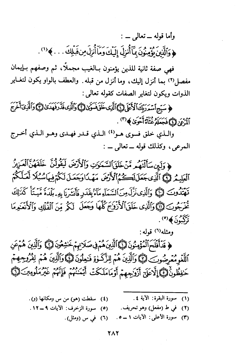 وَأَمَّا قَوْلُهُ - تَعَالَى -: {وَالَّذِينَ يُؤْمِنُونَ بِمَا أُنْزِلَ إِلَيْكَ وَمَا أُنْزِلَ مِنْ قَبْلِكَ} [البقرة: 4] فَهِيَ صِفَةٌ ثَانِيَةٌ لِلَّذِينَ يُؤْمِنُونَ بِالْغَيْبِ مُجْمَلًا، ثُمَّ وَصَفَهُمْ بِإِيمَانٍ مُفَصَّلٍ بِمَا أُنْزِلَ إِلَيْكَ وَمَا أُنْزِلَ مِنْ قَبْلِهِ. وَالْعَطْفُ بِالْوَاوِ يَكُونُ لِتَغَايُرِ الذَّوَاتِ وَيَكُونُ لِتَغَايُرِ الصِّفَاتِ كَقَوْلِهِ - تَعَالَى -: {سَبِّحِ اسْمَ رَبِّكَ الْأَعْلَى - الَّذِي خَلَقَ فَسَوَّى - وَالَّذِي قَدَّرَ فَهَدَى - وَالَّذِي أَخْرَجَ الْمَرْعَى - فَجَعَلَهُ غُثَاءً أَحْوَى} [الأعلى: 1 - 5] وَالَّذِي خَلَقَ فَسَوَّى هُوَ الَّذِي قَدَّرَ فَهَدَى وَهُوَ الَّذِي أَخْرَجَ الْمَرْعَى وَكَذَلِكَ قَوْلُهُ - تَعَالَى -: {وَلَئِنْ سَأَلْتَهُمْ مَنْ خَلَقَ السَّمَاوَاتِ وَالْأَرْضَ لَيَقُولُنَّ خَلَقَهُنَّ الْعَزِيزُ الْعَلِيمُ - الَّذِي جَعَلَ لَكُمُ الْأَرْضَ مَهْدًا وَجَعَلَ لَكُمْ فِيهَا سُبُلًا لَعَلَّكُمْ تَهْتَدُونَ - وَالَّذِي نَزَّلَ مِنَ السَّمَاءِ مَاءً بِقَدَرٍ فَأَنْشَرْنَا بِهِ بَلْدَةً مَيْتًا كَذَلِكَ تُخْرَجُونَ - وَالَّذِي خَلَقَ الْأَزْوَاجَ كُلَّهَا وَجَعَلَ لَكُمْ مِنَ الْفُلْكِ وَالْأَنْعَامِ مَا تَرْكَبُونَ} [الزخرف: 9 - 12] وَمِثْلُهُ قَوْلُهُ: {قَدْ أَفْلَحَ الْمُؤْمِنُونَ - الَّذِينَ هُمْ فِي صَلَاتِهِمْ خَاشِعُونَ - وَالَّذِينَ هُمْ عَنِ اللَّغْوِ مُعْرِضُونَ - وَالَّذِينَ هُمْ لِلزَّكَاةِ فَاعِلُونَ - وَالَّذِينَ هُمْ لِفُرُوجِهِمْ حَافِظُونَ - إِلَّا عَلَى أَزْوَاجِهِمْ أوْ مَا مَلَكَتْ أَيْمَانُهُمْ فَإِنَّهُمْ غَيْرُ مَلُومِينَ - فَمَنِ ابْتَغَى وَرَاءَ ذَلِكَ فَأُولَئِكَ هُمُ الْعَادُونَ - وَالَّذِينَ هُمْ لِأَمَانَاتِهِمْ وَعَهْدِهِمْ رَاعُونَ - وَالَّذِينَ هُمْ عَلَى صَلَوَاتِهِمْ يُحَافِظُونَ - أُولَئِكَ هُمُ الْوَارِثُونَ - الَّذِينَ يَرِثُونَ الْفِرْدَوْسَ هُمْ فِيهَا خَالِدُونَ} [المؤمنون: 1 - 11] .