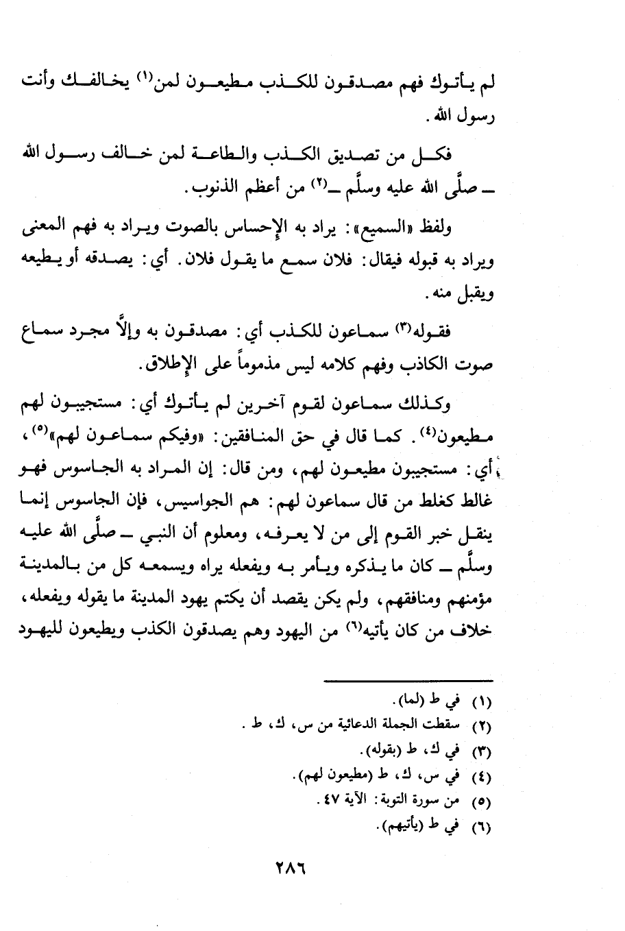وَكَذَلِكَ سَمَّاعُونَ لِقَوْمٍ آخَرِينَ لَمْ يَأْتُوكَ أَيْ مُسْتَجِيبُونَ لَهُمْ مُطِيعُونَ ; كَمَا قَالَ: فِي حَقِّ الْمُنَافِقِينَ وَفِيكُمْ سَمَّاعُونَ لَهُمْ أَيْ مُسْتَجِيبُونَ مُطِيعُونَ لَهُمْ وَمَنْ قَالَ: إِنَّ الْمُرَادَ بِهِ الْجَاسُوسُ فَهُوَ غَالِطٌ كَغَلَطِ مَنْ قَالَ: سَمَّاعُونَ لَهُمْ هُمُ الْجَوَاسِيسُ، فَإِنَّ الْجَاسُوسَ إِنَّمَا يَنْقُلُ خَبَرَ الْقَوْمِ إِلَى مَنْ لَا يَعْرِفُهُ، وَمَعْلُومٌ أَنَّ النَّبِيَّ - صَلَّى اللَّهُ عَلَيْهِ وَسَلَّمَ - كَانَ مَا يَذْكُرُهُ وَيَأْمُرُ بِهِ وَيَفْعَلُهُ يَرَاهُ وَيَسْمَعُهُ كُلُّ مَنْ بِالْمَدِينَةِ مُؤْمِنُهُمْ وَمُنَافِقُهُمْ وَلَمْ يَكُنْ يَقْصِدُ أَنْ يَكْتُمَ يَهُودَ الْمَدِينَةِ مَا يَقُولُهُ وَيَفْعَلُهُ خِلَافَ مَنْ كَانَ يَأْتِيهِ مِنَ الْيَهُودِ وَهُمْ يُصَدِّقُونَ الْكَذِبَ وَيُطِيعُونَ لِلْيَهُودِ