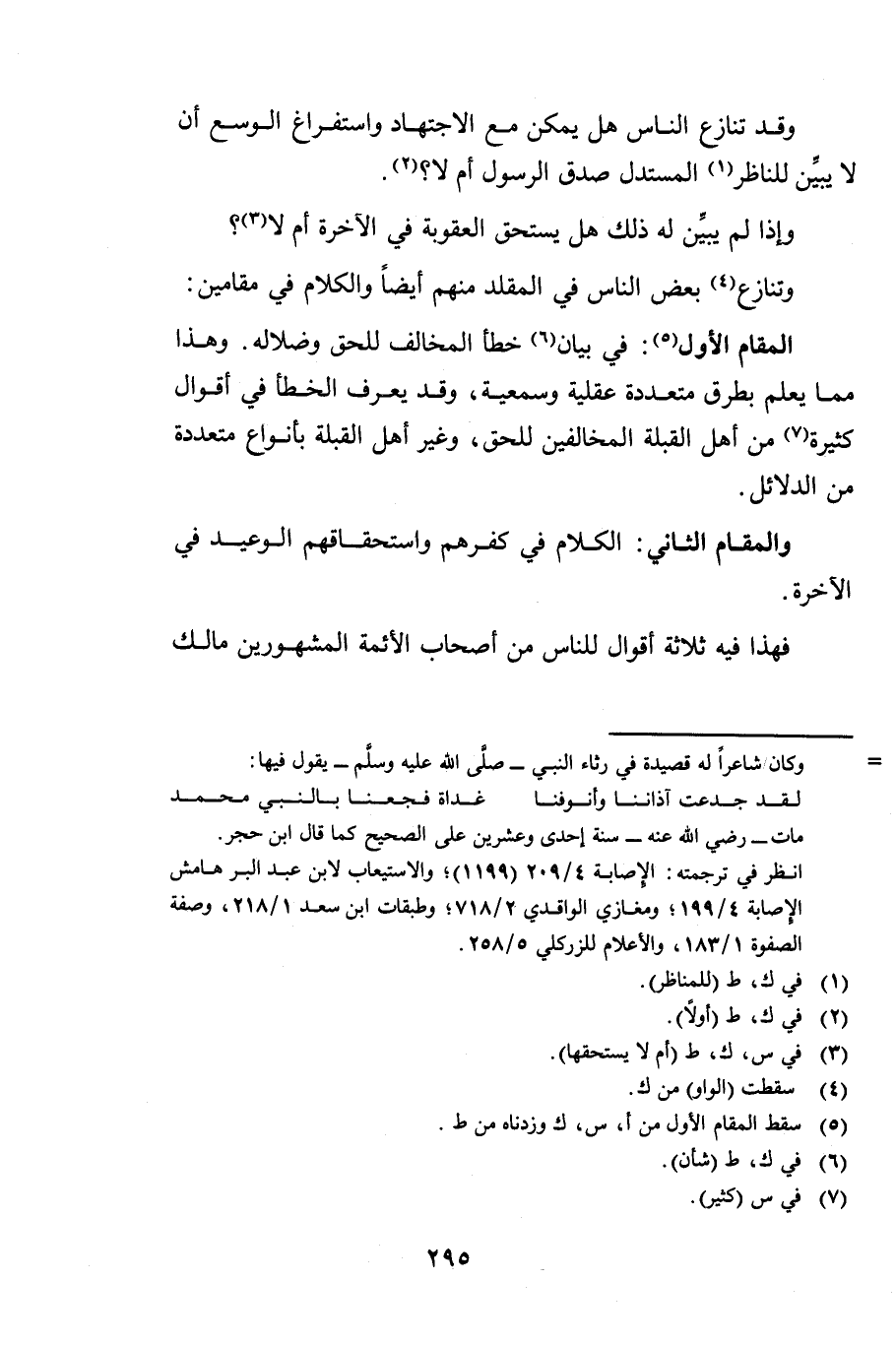 وَتَنَازَعَ بَعْضُ النَّاسِ فِي الْمُقَلِّدِ مِنْهُمْ أَيْضًا وَالْكَلَامُ فِي مَقَامَيْنِ: الْمَقَامُ الْأَوَّلُ: فِي بَيَانِ خَطَأِ الْمُخَالِفِ لِلْحَقِّ وَضَلَالِهِ وَهَذَا مِمَّا يُعْلَمُ بِطُرُقٍ مُتَعَدِّدَةٍ عَقْلِيَّةٍ وَسَمْعِيَّةٍ وَقَدْ يُعْرَفُ الْخَطَأُ فِي أَقْوَالٍ كَثِيرَةٍ مِنْ أَهْلِ الْقِبْلَةِ الْمُخَالِفِينَ لِلْحَقِّ وَغَيْرِ أَهْلِ الْقِبْلَةِ بِأَنْوَاعٍ مُتَعَدِّدَةٍ مِنَ الدَّلَائِلِ.