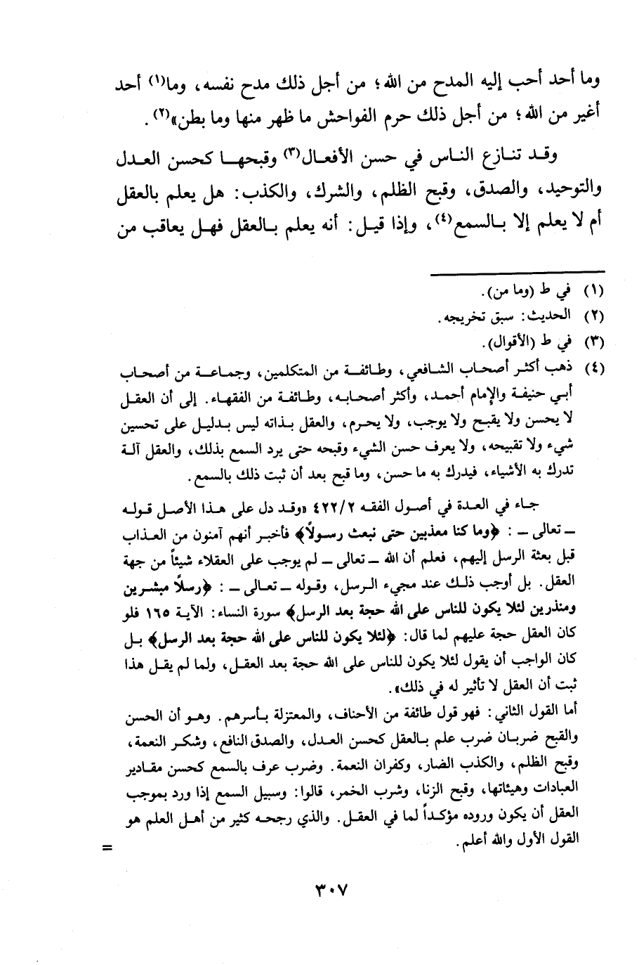 وَقَدْ تَنَازَعَ النَّاسُ فِي حُسْنِ الْأَفْعَالِ وَقُبْحِهَا كَحُسْنِ الْعَدْلِ وَالتَّوْحِيدِ وَالصِّدْقِ وَقُبْحِ الظُّلْمِ وَالشِّرْكِ وَالْكَذِبِ هَلْ يُعْلَمُ بِالْعَقْلِ أَمْ لَا يُعْلَمُ إِلَّا بِالسَّمْعِ وَإِذَا قِيلَ أَنَّهُ يُعْلَمُ بِالْعَقْلِ فَهَلْ يُعَاقَبُ مَنْ
