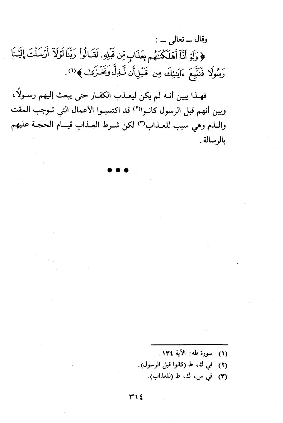 وَقَالَ - تَعَالَى -: {وَلَوْ أَنَّا أَهْلَكْنَاهُمْ بِعَذَابٍ مِنْ قَبْلِهِ لَقَالُوا رَبَّنَا لَوْلَا أَرْسَلْتَ إِلَيْنَا رَسُولًا فَنَتَّبِعَ آيَاتِكَ مِنْ قَبْلِ أَنْ نَذِلَّ وَنَخْزَى} [طه: 134] فَهَذَا يُبَيِّنُ أَنَّهُ لَمْ يَكُنْ لِيُعَذِّبَ الْكُفَّارَ حَتَّى يَبْعَثَ إِلَيْهِمْ رَسُولًا، وَبَيَّنَ أَنَّهُمْ قَبْلَ الرَّسُولِ كَانُوا قَدِ اكْتَسَبُوا الْأَعْمَالَ الَّتِي تُوجِبُ الْمَقْتَ وَالذَّمَّ وَهِيَ سَبَبٌ لِلْعَذَابِ، لَكِنْ شَرْطُ الْعَذَابِ قِيَامُ الْحُجَّةِ عَلَيْهِمْ بِالرِّسَالَةِ.