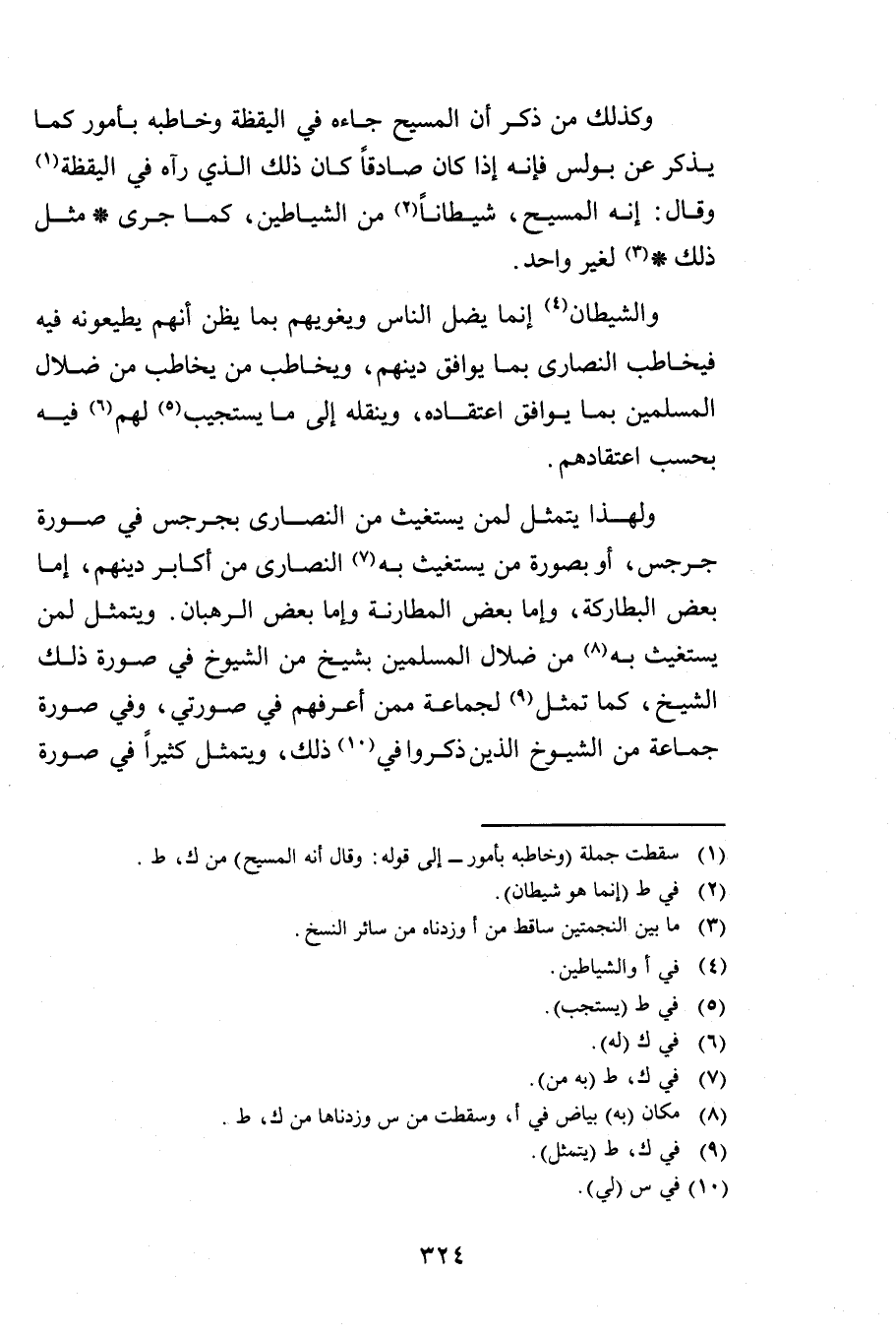 وَلِهَذَا يَتَمَثَّلُ لِمَنْ يَسْتَغِيثُ مِنَ النَّصَارَى بِجِرْجِسَ فِي صُورَةِ جِرْجِسَ أَوْ بِصُورَةِ مَنْ يَسْتَغِيثُ بِهِ النَّصَارَى مِنْ أَكَابِرِ دِينِهِمْ، إِمَّا بَعْضُ الْبَطَارِكَةِ، وَإِمَّا بَعْضُ الْمَطَارِنَةِ، وَإِمَّا بَعْضُ الرُّهْبَانِ، وَيَتَمَثَّلُ لِمَنْ يَسْتَغِيثُ بِهِ مِنْ ضُلَّالِ الْمُسْلِمِينَ بِشَيْخٍ مِنَ الشُّيُوخِ فِي صُورَةِ ذَلِكَ الشَّيْخِ ; كَمَا تَمَثَّلَ لِجَمَاعَةٍ مِمَّنْ أَعْرِفُهُمْ فِي صُورَتِي وَفِي صُورَةِ جَمَاعَةٍ مِنَ الشُّيُوخِ الَّذِينَ ذَكَرُوا فِيَّ ذَلِكَ وَيَتَمَثَّلُ كَثِيرًا فِي صُورَةِ