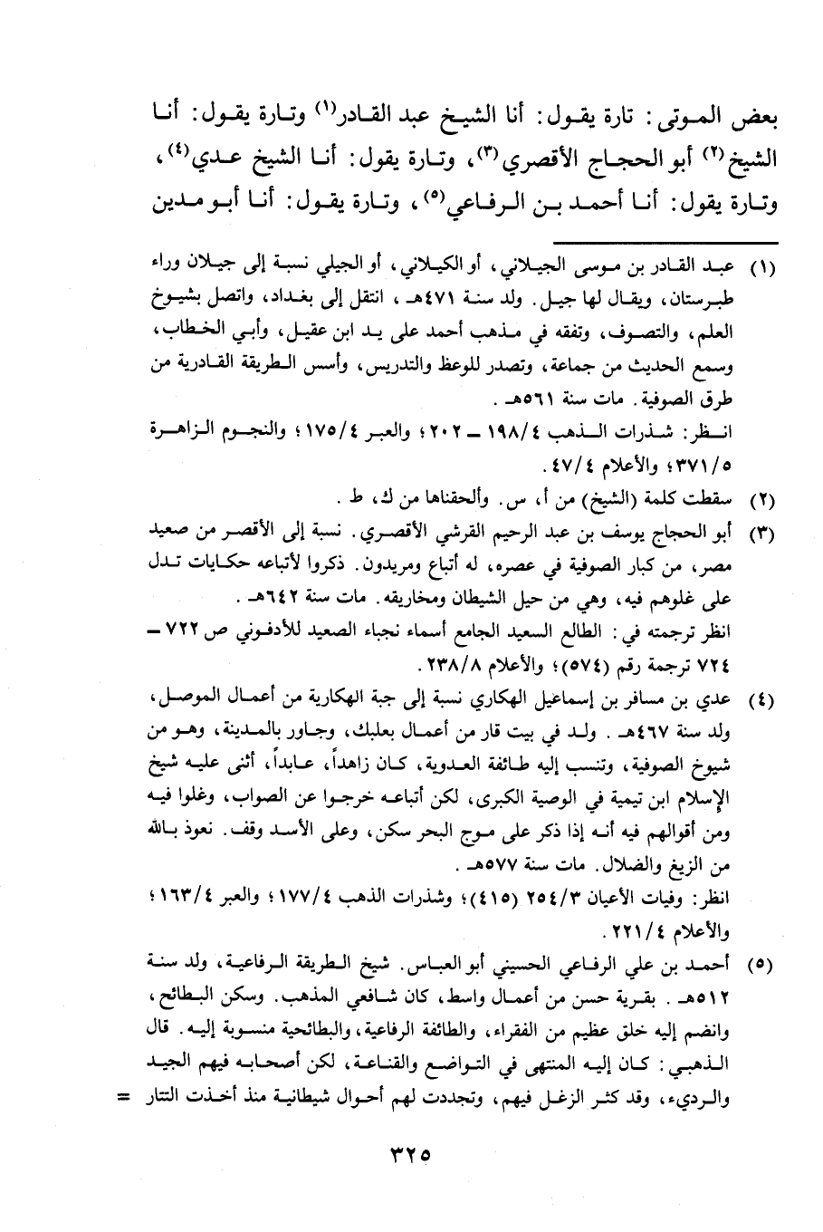 بَعْضِ الْمَوْتَى تَارَةً يَقُولُ أَنَا الشَّيْخُ عَبْدُ الْقَادِرِ وَتَارَةً يَقُولُ أَنَا الشَّيْخُ أَبُو الْحَجَّاجِ الْأَقْصُرِيُّ وَتَارَةً يَقُولُ أَنَا الشَّيْخُ عَدِيٌّ وَتَارَةً يَقُولُ أَنَا أَحْمَدُ بْنُ الرِّفَاعِيِّ وَتَارَةً يَقُولُ أَنَا أَبُو مَدْيَنَ