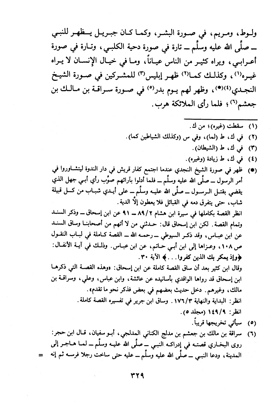 وَلُوطٍ وَمَرْيَمَ فِي صُورَةِ الْبَشَرِ وَكَمَا كَانَ جِبْرِيلُ يَظْهَرُ لِلنَّبِيِّ - صَلَّى اللَّهُ عَلَيْهِ وَسَلَّمَ - تَارَةً فِي صُورَةِ دِحْيَةَ الْكَلْبِيِّ وَتَارَةً فِي صُورَةِ أَعْرَابِيٍّ وَيَرَاهُ كَثِيرٌ مِنَ النَّاسِ عِيَانًا وَمَا فِي خَيَالِ الْإِنْسَانِ لَا يَرَاهُ غَيْرُهُ، وَكَذَلِكَ كَمَا ظَهَرَ إِبْلِيسُ لِلْمُشْرِكِينَ فِي صُورَةِ الشَّيْخِ النَّجْدِيِّ وَظَهَرَ لَهُمْ يَوْمَ بَدْرٍ فِي صُورَةِ سُرَاقَةَ بْنِ مَالِكِ بْنِ جُعْشُمٍ فَلَمَّا رَأَى الْمَلَائِكَةَ هَرَبَ.