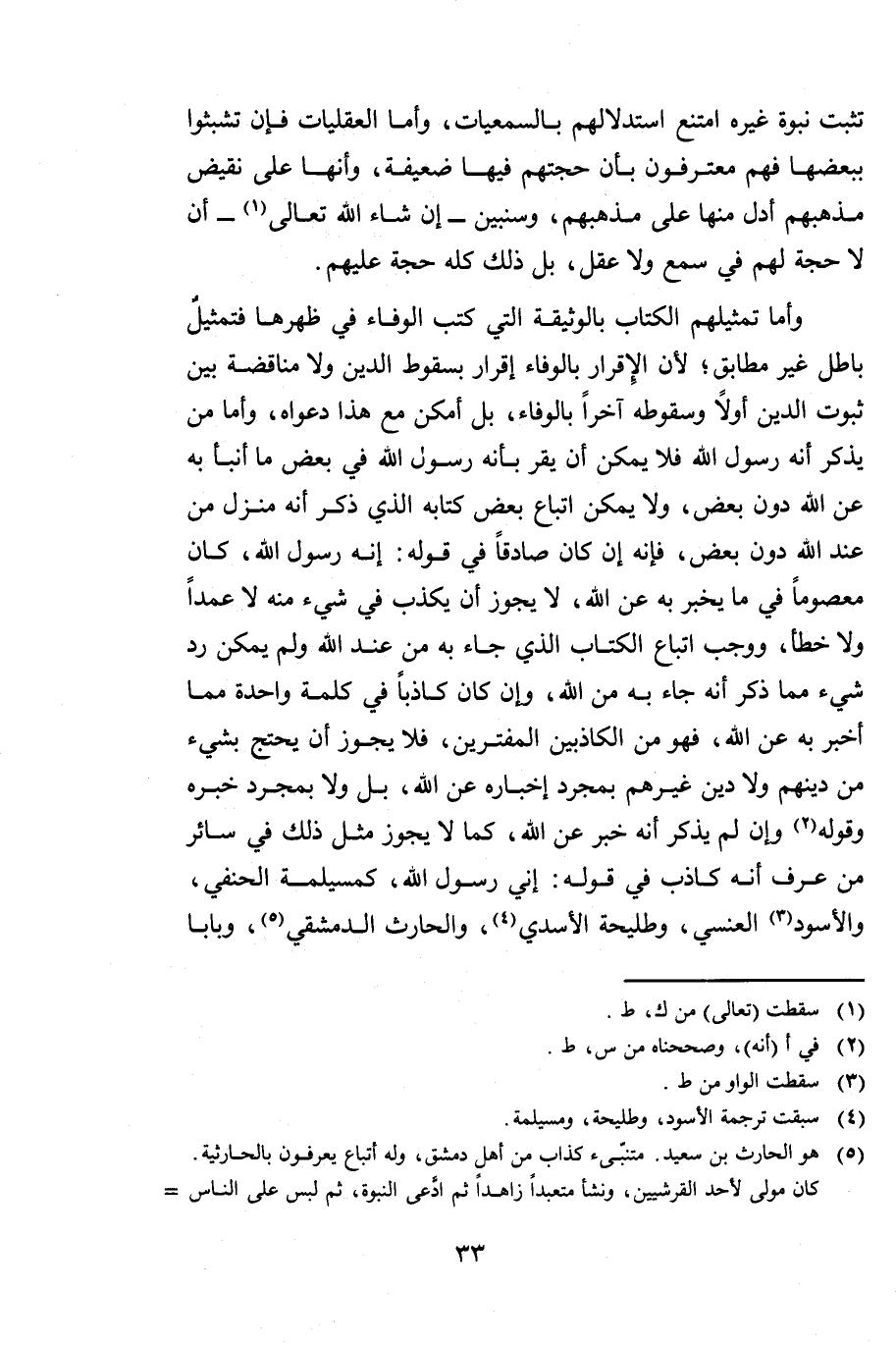 تَثْبُتَ نُبُوَّةُ غَيْرِهِ امْتَنَعَ اسْتِدْلَالُهُمْ بِالسَّمْعِيَّاتِ وَأَمَّا الْعَقْلِيَّاتُ، فَإِنْ تَشَبَّثُوا بِبَعْضِهَا فَهُمْ مُعْتَرِفُونَ بِأَنَّ حُجَّتَهُمْ فِيهَا ضَعِيفَةٌ وَأَنَّهَا عَلَى نَقِيضِ مَذْهَبِهِمْ أَدَلُّ مِنْهَا عَلَى مَذْهَبِهِمْ وَسَنُبَيِّنُ إِنْ شَاءَ اللَّهُ تَعَالَى أَنْ لَا حُجَّةَ لَهُمْ فِي سَمْعٍ وَلَا عَقْلٍ بَلْ ذَلِكَ كُلُّهُ حُجَّةٌ عَلَيْهِمْ.