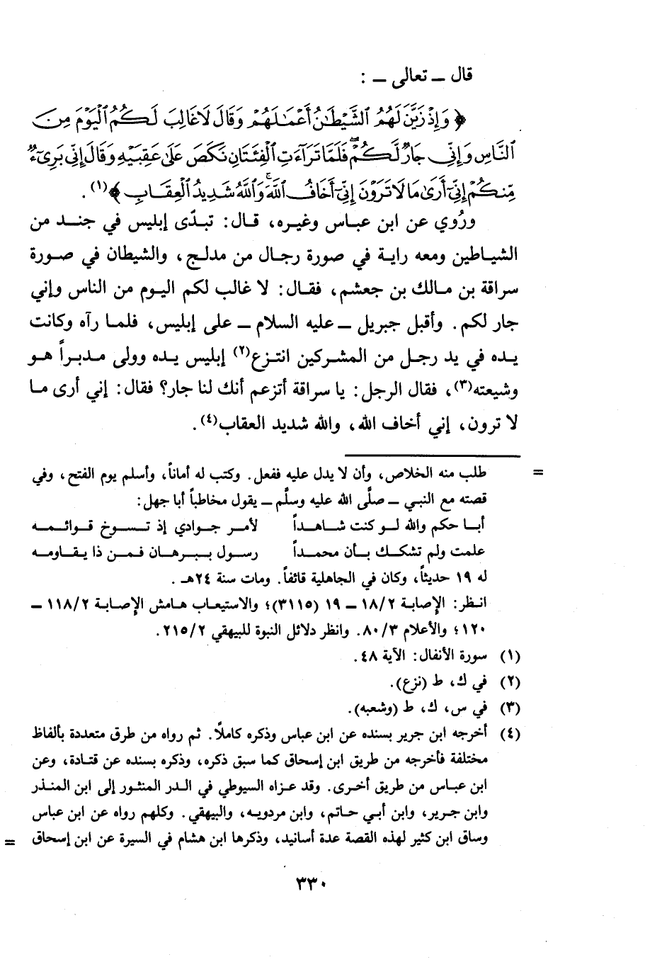 قَالَ - تَعَالَى -: {وَإِذْ زَيَّنَ لَهُمُ الشَّيْطَانُ أَعْمَالَهُمْ وَقَالَ لَا غَالِبَ لَكُمُ الْيَوْمَ مِنَ النَّاسِ وَإِنِّي جَارٌ لَكُمْ فَلَمَّا تَرَاءَتِ الْفِئَتَانِ نَكَصَ عَلَى عَقِبَيْهِ وَقَالَ إِنِّي بَرِيءٌ مِنْكُمْ إِنِّي أَرَى مَا لَا تَرَوْنَ إِنِّي أَخَافُ اللَّهَ وَاللَّهُ شَدِيدُ الْعِقَابِ} [الأنفال: 48] وَرُوِيَ عَنِ ابْنِ عَبَّاسٍ وَغَيْرِهِ قَالَ: تَبَدَّى إِبْلِيسُ فِي جُنْدٍ مِنَ الشَّيَاطِينِ وَمَعَهُ رَايَةٌ فِي صُورَةِ رِجَالٍ مِنْ مُدْلِجٍ، وَالشَّيْطَانُ فِي صُورَةِ سُرَاقَةَ بْنِ مَالِكِ بْنِ جُعْشُمٍ فَقَالَ: {لَا غَالِبَ لَكُمُ الْيَوْمَ مِنَ النَّاسِ وَإِنِّي جَارٌ لَكُمْ} [الأنفال: 48] وَأَقْبَلَ جِبْرِيلُ - عَلَيْهِ السَّلَامُ - عَلَى إِبْلِيسَ فَلَمَّا رَآهُ وَكَانَتْ يَدُهُ فِي يَدِ رَجُلٍ مِنَ الْمُشْرِكِينَ انْتَزَعَ إِبْلِيسُ يَدَهُ وَوَلَّى مُدْبِرًا هُوَ وَشِيعَتُهُ فَقَالَ: الرَّجُلُ يَا سُرَاقَةُ أَتَزْعُمُ أَنَّكَ لَنَا جَارٌ فَقَالَ: {إِنِّي أَرَى مَا لَا تَرَوْنَ إِنِّي أَخَافُ اللَّهَ وَاللَّهُ شَدِيدُ الْعِقَابِ} [الأنفال: 48] .