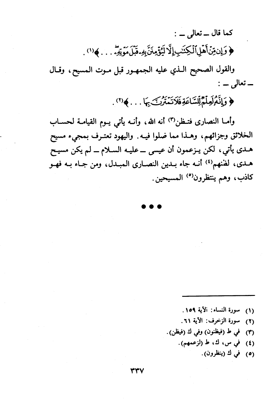 كَمَا قَالَ - تَعَالَى -: {وَإِنْ مِنْ أَهْلِ الْكِتَابِ إِلَّا لَيُؤْمِنَنَّ بِهِ قَبْلَ مَوْتِهِ} [النساء: 159] وَالْقَوْلُ الصَّحِيحُ الَّذِي عَلَيْهِ الْجُمْهُورُ قَبْلَ مَوْتِ الْمَسِيحِ وَقَالَ - تَعَالَى -: {وَإِنَّهُ لَعِلْمٌ لِلسَّاعَةِ فَلَا تَمْتَرُنَّ بِهَا} [الزخرف: 61] وَأَمَّا النَّصَارَى فَتَظُنُّ أَنَّهُ اللَّهُ وَأَنَّهُ يَأْتِي يَوْمَ الْقِيَامَةِ لِحِسَابِ الْخَلَائِقِ وَجَزَائِهِمْ وَهَذَا مِمَّا ضَلُّوا فِيهِ وَالْيَهُودُ تَعْتَرِفُ بِمَجِيءِ مَسِيحِ هُدًى يَأْتِي لَكِنْ يَزْعُمُونَ أَنَّ عِيسَى - عَلَيْهِ السَّلَامُ - لَمْ يَكُنْ مَسِيحَ هُدًى لِظَنِّهِمْ أَنَّهُ جَاءَ بِدِينِ النَّصَارَى الْمُبْدَلِ وَمَنْ جَاءَ بِهِ فَهُوَ كَاذِبٌ وَهُمْ يَنْتَظِرُونَ الْمَسِيحَيْنِ.