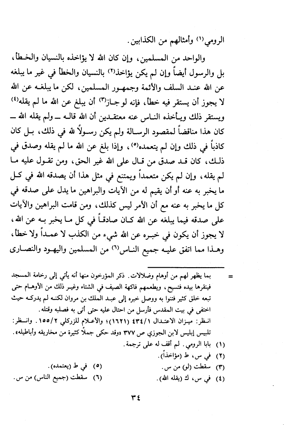 وَالْوَاحِدُ مِنَ الْمُسْلِمِينَ وَإِنْ كَانَ اللَّهُ لَا يُؤَاخِذُهُ بِالنِّسْيَانِ وَالْخَطَأِ بَلْ وَالرَّسُولُ أَيْضًا وَإِنْ لَمْ يَكُنْ يُؤَاخَذُ بِالنِّسْيَانِ وَالْخَطَأِ فِي غَيْرِ مَا يُبَلِّغُهُ عَنِ اللَّهِ عِنْدَ السَّلَفِ وَالْأَئِمَّةِ وَجُمْهُورِ الْمُسْلِمِينَ، لَكِنَّ مَا يُبَلِّغُهُ عَنِ اللَّهِ لَا يَجُوزُ أَنْ يَسْتَقِرَّ فِيهِ خَطَأٌ، فَإِنَّهُ لَوْ جَازَ أَنْ يُبَلِّغَ عَنِ اللَّهِ مَا لَمْ يَقُلْهُ وَيَسْتَقِرَّ ذَلِكَ وَيَأْخُذَهُ النَّاسُ عَنْهُ مُعْتَقِدِينَ أَنَّ اللَّهَ قَالَهُ - وَلَمْ يَقُلْهُ اللَّهُ - كَانَ هَذَا مُنَاقِضًا لِمَقْصُودِ الرِّسَالَةِ وَلَمْ يَكُنْ رَسُولًا لِلَّهِ فِي ذَلِكَ بَلْ كَانَ كَاذِبًا فِي ذَلِكَ وَإِنْ لَمْ يَتَعَمَّدْهُ وَإِذَا بَلَّغَ عَنِ اللَّهِ مَا لَمْ يَقُلْهُ وَصُدِّقَ فِي ذَلِكَ كَانَ قَدْ صُدِّقَ مَنْ قَالَ عَلَى اللَّهِ غَيْرَ الْحَقِّ، وَمَنْ تَقَوَّلَ عَلَيْهِ مَا لَمْ يَقُلْهُ، وَإِنْ لَمْ يَكُنْ مُتَعَمِّدًا، وَيَمْتَنِعُ فِي مِثْلِ هَذَا أَنْ يُصَدِّقَهُ اللَّهُ فِي كُلِّ مَا يُخْبِرُ بِهِ عَنْهُ أَوْ أَنْ يُقِيمَ لَهُ مِنَ الْآيَاتِ وَالْبَرَاهِينِ مَا يَدُلُّ عَلَى صِدْقِهِ فِي كُلِّ مَا يُخْبِرُ بِهِ عَنْهُ مَعَ أَنَّ الْأَمْرَ لَيْسَ كَذَلِكَ وَمَنْ قَامَتِ الْبَرَاهِينُ وَالْآيَاتُ عَلَى صِدْقِهِ فِيمَا يُبَلِّغُهُ عَنِ اللَّهِ كَانَ صَادِقًا فِي كُلِّ مَا يُخْبِرُ بِهِ عَنِ اللَّهِ لَا يَجُوزُ أَنْ يَكُونَ فِي خَبَرِهِ عَنِ اللَّهِ شَيْءٌ مِنَ الْكَذِبِ لَا عَمْدًا وَلَا خَطَأً، وَهَذَا مِمَّا اتَّفَقَ عَلَيْهِ جَمِيعُ النَّاسِ مِنَ الْمُسْلِمِينَ وَالْيَهُودِ وَالنَّصَارَى