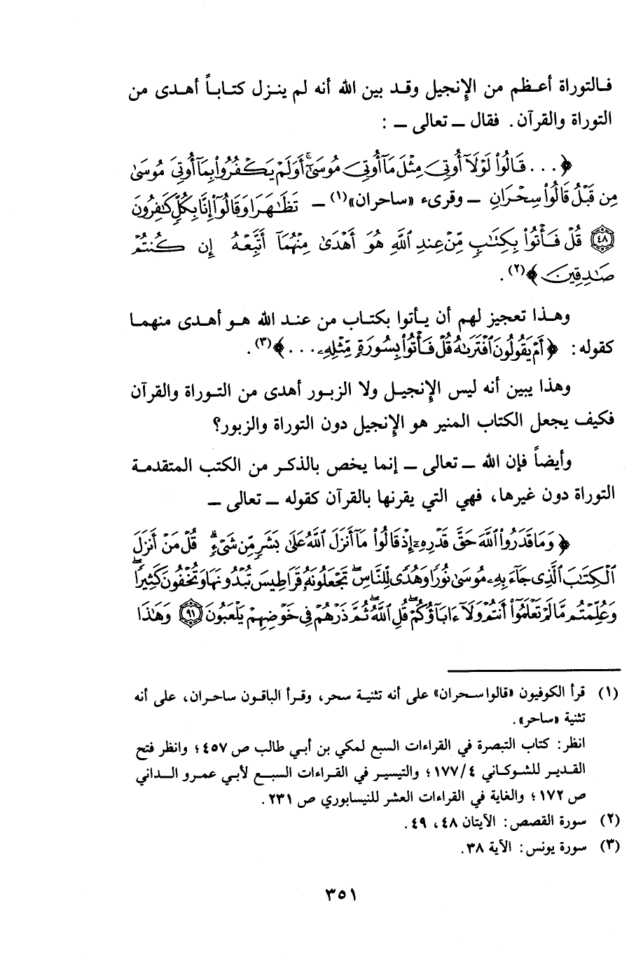 وَأَيْضًا فَإِنَّ اللَّهَ تَعَالَى إِنَّمَا يَخُصُّ بِالذِّكْرِ مِنَ الْكُتُبِ الْمُتَقَدِّمَةِ التَّوْرَاةَ دُونَ غَيْرِهَا فَهِيَ الَّتِي يُقْرِنُهَا بِالْقُرْآنِ، كَقَوْلِهِ - تَعَالَى -: {وَمَا قَدَرُوا اللَّهَ حَقَّ قَدْرِهِ إِذْ قَالُوا مَا أَنْزَلَ اللَّهُ عَلَى بَشَرٍ مِنْ شَيْءٍ قُلْ مَنْ أَنْزَلَ الْكِتَابَ الَّذِي جَاءَ بِهِ مُوسَى نُورًا وَهُدًى لِلنَّاسِ تَجْعَلُونَهُ قَرَاطِيسَ تُبْدُونَهَا وَتُخْفُونَ كَثِيرًا وَعُلِّمْتُمْ مَا لَمْ تَعْلَمُوا أَنْتُمْ وَلَا آبَاؤُكُمْ قُلِ اللَّهُ ثُمَّ ذَرْهُمْ فِي خَوْضِهِمْ يَلْعَبُونَ - وَهَذَا كِتَابٌ أَنْزَلْنَاهُ مُبَارَكٌ مُصَدِّقُ الَّذِي بَيْنَ يَدَيْهِ وَلِتُنْذِرَ أُمَّ الْقُرَى وَمَنْ حَوْلَهَا وَالَّذِينَ يُؤْمِنُونَ بِالْآخِرَةِ يُؤْمِنُونَ بِهِ وَهُمْ عَلَى صَلَاتِهِمْ يُحَافِظُونَ} [الأنعام: 91 - 92]