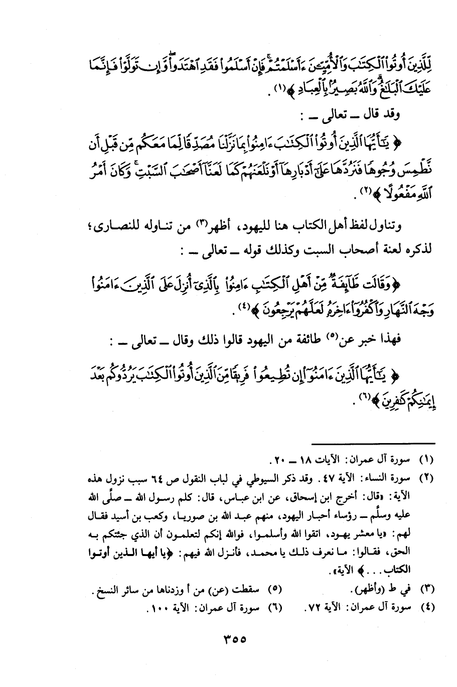 وَقَدْ قَالَ - تَعَالَى -: {يَاأَيُّهَا الَّذِينَ أُوتُوا الْكِتَابَ آمِنُوا بِمَا نَزَّلْنَا مُصَدِّقًا لِمَا مَعَكُمْ مِنْ قَبْلِ أَنْ نَطْمِسَ وُجُوهًا فَنَرُدَّهَا عَلَى أَدْبَارِهَا أَوْ نَلْعَنَهُمْ كَمَا لَعَنَّا أَصْحَابَ السَّبْتِ وَكَانَ أَمْرُ اللَّهِ مَفْعُولًا} [النساء: 47] . وَتَنَاوُلُ لَفْظِ أَهْلِ الْكِتَابِ هُنَا لِلْيَهُودِ أَظْهَرُ مِنْ تَنَاوُلِهِ لِلنَّصَارَى لِذِكْرِهِ لَعْنَةَ أَصْحَابِ السَّبْتِ، وَكَذَلِكَ قَوْلُهُ - تَعَالَى -: {وَقَالَتْ طَائِفَةٌ مِنْ أَهْلِ الْكِتَابِ آمِنُوا بِالَّذِي أُنْزِلَ عَلَى الَّذِينَ آمَنُوا وَجْهَ النَّهَارِ وَاكْفُرُوا آخِرَهُ لَعَلَّهُمْ يَرْجِعُونَ} [آل عمران: 72] فَهَذَا خَبَرٌ عَنْ طَائِفَةٍ مِنَ الْيَهُودِ قَالُوا: ذَلِكَ وَقَالَ - تَعَالَى -: {يَاأَيُّهَا الَّذِينَ آمَنُوا إِنْ تُطِيعُوا فَرِيقًا مِنَ الَّذِينَ أُوتُوا الْكِتَابَ يَرُدُّوكُمْ بَعْدَ إِيمَانِكُمْ كَافِرِينَ} [آل عمران: 100]