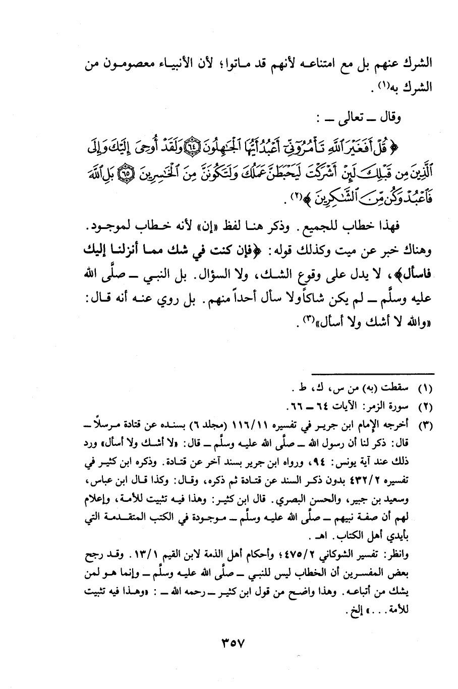 وَقَالَ - تَعَالَى -: {قُلْ أَفَغَيْرَ اللَّهِ تَأْمُرُونِّي أَعْبُدُ أَيُّهَا الْجَاهِلُونَ وَلَقَدْ أُوحِيَ إِلَيْكَ وَإِلَى الَّذِينَ مِنْ قَبْلِكَ لَئِنْ أَشْرَكْتَ لَيَحْبَطَنَّ عَمَلُكَ وَلَتَكُونَنَّ مِنَ الْخَاسِرِينَ - بَلِ اللَّهَ فَاعْبُدْ وَكُنْ مِنَ الشَّاكِرِينَ} [الزمر: 64 - 66] فَهَذَا خِطَابٌ لِلْجَمِيعِ. وَذَكَرَ هُنَا لَفْظَ إِنَّ لِأَنَّهُ خِطَابٌ لِمَوْجُودٍ. وَهُنَاكَ خَبَرٌ عَنْ مَيِّتٍ وَكَذَلِكَ قَوْلُهُ: {فَإِنْ كُنْتَ فِي شَكٍّ مِمَّا أَنْزَلْنَا إِلَيْكَ فَاسْأَلِ} [يونس: 94] لَا يَدُلُّ عَلَى وُقُوعِ الشَّكِّ، وَلَا السُّؤَالِ، بَلِ النَّبِيُّ - صَلَّى اللَّهُ عَلَيْهِ وَسَلَّمَ - لَمْ يَكُنْ شَاكًّا وَلَا سَأَلَ أَحَدًا مِنْهُمْ بَلْ رُوِيَ عَنْهُ أَنَّهُ قَالَ: «وَاللَّهِ لَا أَشُكُّ وَلَا أَسْأَلُ» .