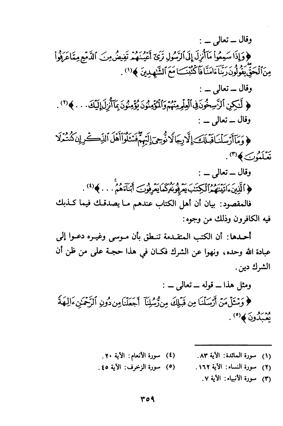 وَقَالَ - تَعَالَى -: {وَإِذَا سَمِعُوا مَا أُنْزِلَ إِلَى الرَّسُولِ تَرَى أَعْيُنَهُمْ تَفِيضُ مِنَ الدَّمْعِ مِمَّا عَرَفُوا مِنَ الْحَقِّ يَقُولُونَ رَبَّنَا آمَنَّا فَاكْتُبْنَا مَعَ الشَّاهِدِينَ} [المائدة: 83] وَقَالَ - تَعَالَى -: {لَكِنِ الرَّاسِخُونَ فِي الْعِلْمِ مِنْهُمْ وَالْمُؤْمِنُونَ يُؤْمِنُونَ بِمَا أُنْزِلَ إِلَيْكَ} [النساء: 162] وَقَالَ - تَعَالَى -: {وَمَا أَرْسَلْنَا قَبْلَكَ إِلَّا رِجَالًا نُوحِي إِلَيْهِمْ فَاسْأَلُوا أَهْلَ الذِّكْرِ إِنْ كُنْتُمْ لَا تَعْلَمُونَ} [الأنبياء: 7] وَقَالَ - تَعَالَى -: {الَّذِينَ آتَيْنَاهُمُ الْكِتَابَ يَعْرِفُونَهُ كَمَا يَعْرِفُونَ أَبْنَاءَهُمْ} [البقرة: 146] فَالْمَقْصُودُ بَيَانُ أَنَّ أَهْلَ الْكِتَابِ عِنْدَهُمْ مَا يُصَدِّقُكَ فِيمَا كَذَّبَكَ فِيهِ الْكَافِرُونَ وَذَلِكَ مِنْ وُجُوهٍ.
