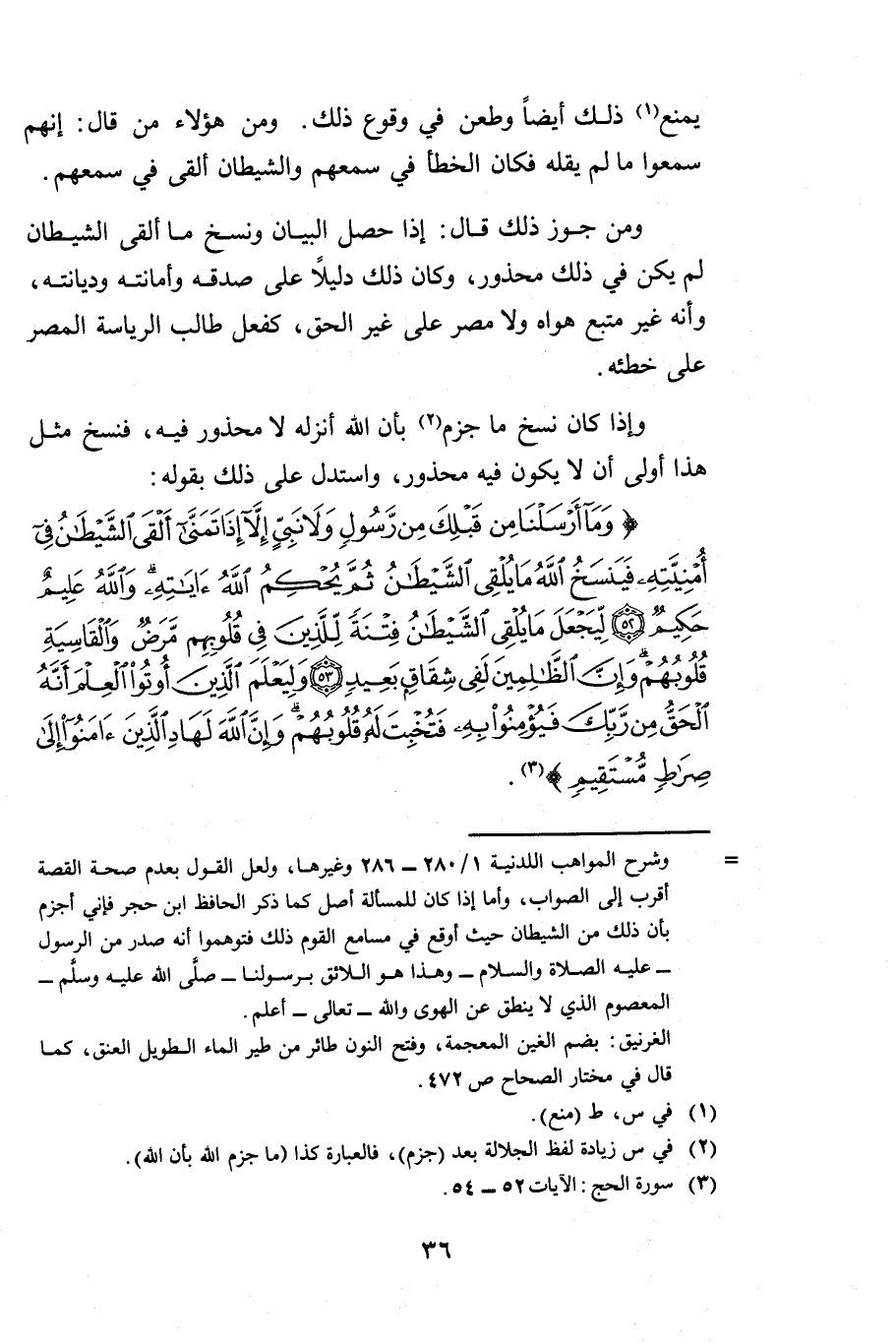 وَمَنْ جَوَّزَ ذَلِكَ قَالَ: إِذَا حَصَلَ الْبَيَانُ وَنُسِخَ مَا أَلْقَى الشَّيْطَانُ لَمْ يَكُنْ فِي ذَلِكَ مَحْذُورٌ، وَكَانَ ذَلِكَ دَلِيلًا عَلَى صِدْقِهِ وَأَمَانَتِهِ وَدِيَانَتِهِ، وَأَنَّهُ غَيْرُ مُتَّبِعٍ هَوَاهُ وَلَا مُصِرٍّ عَلَى غَيْرِ الْحَقِّ، كَفِعْلِ طَالِبِ الرِّيَاسَةِ الْمُصِرِّ عَلَى خَطَئِهِ.