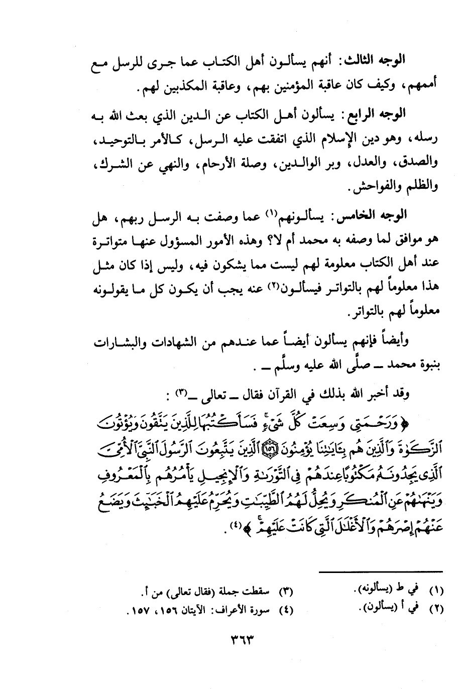 الْوَجْهُ الْخَامِسُ: يَسْأَلُونَهُمْ عَمَّا وَصَفَتْ بِهِ الرُّسُلُ رَبَّهُمْ هَلْ هُوَ مُوَافِقٌ لِمَا وَصَفَهُ بِهِ مُحَمَّدٌ أَمْ لَا؟ وَهَذِهِ الْأُمُورُ الْمَسْؤُولُ عَنْهَا مُتَوَاتِرَةٌ عِنْدَ أَهْلِ الْكِتَابِ مَعْلُومَةٌ لَهُمْ لَيْسَتْ مِمَّا يَشُكُّونَ فِيهِ وَلَيْسَ إِذَا كَانَ مِثْلُ هَذَا مَعْلُومًا لَهُمْ بِالتَّوَاتُرِ فَيُسْأَلُونَ عَنْهُ يَجِبُ أَنْ يَكُونَ كُلُّ مَا يَقُولُونَهُ مَعْلُومًا لَهُمْ بِالتَّوَاتُرِ.