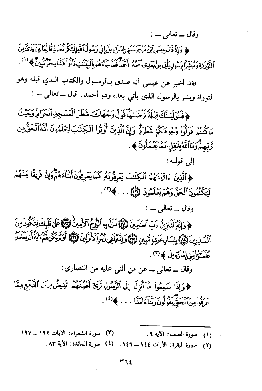 فَقَدْ أَخْبَرَ عَنْ عِيسَى أَنَّهُ صَدَّقَ بِالرَّسُولِ وَالْكِتَابِ الَّذِي قَبْلَهُ وَهُوَ التَّوْرَاةُ وَبَشَّرَ بِالرَّسُولِ الَّذِي يَأْتِي بَعْدَهُ وَهُوَ أَحْمَدُ. قَالَ - تَعَالَى -: {فَلَنُوَلِّيَنَّكَ قِبْلَةً تَرْضَاهَا فَوَلِّ وَجْهَكَ شَطْرَ الْمَسْجِدِ الْحَرَامِ وَحَيْثُ مَا كُنْتُمْ فَوَلُّوا وُجُوهَكُمْ شَطْرَهُ وَإِنَّ الَّذِينَ أُوتُوا الْكِتَابَ لَيَعْلَمُونَ أَنَّهُ الْحَقُّ مِنْ رَبِّهِمْ وَمَا اللَّهُ بِغَافِلٍ عَمَّا يَعْمَلُونَ} [البقرة: 144] إِلَى قَوْلِهِ: {الَّذِينَ آتَيْنَاهُمُ الْكِتَابَ يَعْرِفُونَهُ كَمَا يَعْرِفُونَ أَبْنَاءَهُمْ وَإِنَّ فَرِيقًا مِنْهُمْ لَيَكْتُمُونَ الْحَقَّ وَهُمْ يَعْلَمُونَ} [البقرة: 146] وَقَالَ - تَعَالَى -: {وَإِنَّهُ لَتَنْزِيلُ رَبِّ الْعَالَمِينَ - نَزَلَ بِهِ الرُّوحُ الْأَمِينُ - عَلَى قَلْبِكَ لِتَكُونَ مِنَ الْمُنْذِرِينَ - بِلِسَانٍ عَرَبِيٍّ مُبِينٍ - وَإِنَّهُ لَفِي زُبُرِ الْأَوَّلِينَ - أَوَلَمْ يَكُنْ لَهُمْ آيَةً أَنْ يَعْلَمَهُ عُلَمَاءُ بَنِي إِسْرَائِيلَ} [الشعراء: 192 - 197] وَقَالَ - تَعَالَى -: عَنْ مَنْ أَثْنَى عَلَيْهِ مِنَ النَّصَارَى {وَإِذَا سَمِعُوا مَا أُنْزِلَ إِلَى الرَّسُولِ تَرَى أَعْيُنَهُمْ تَفِيضُ مِنَ الدَّمْعِ مِمَّا عَرَفُوا مِنَ الْحَقِّ يَقُولُونَ رَبَّنَا آمَنَّا} [المائدة: 83]