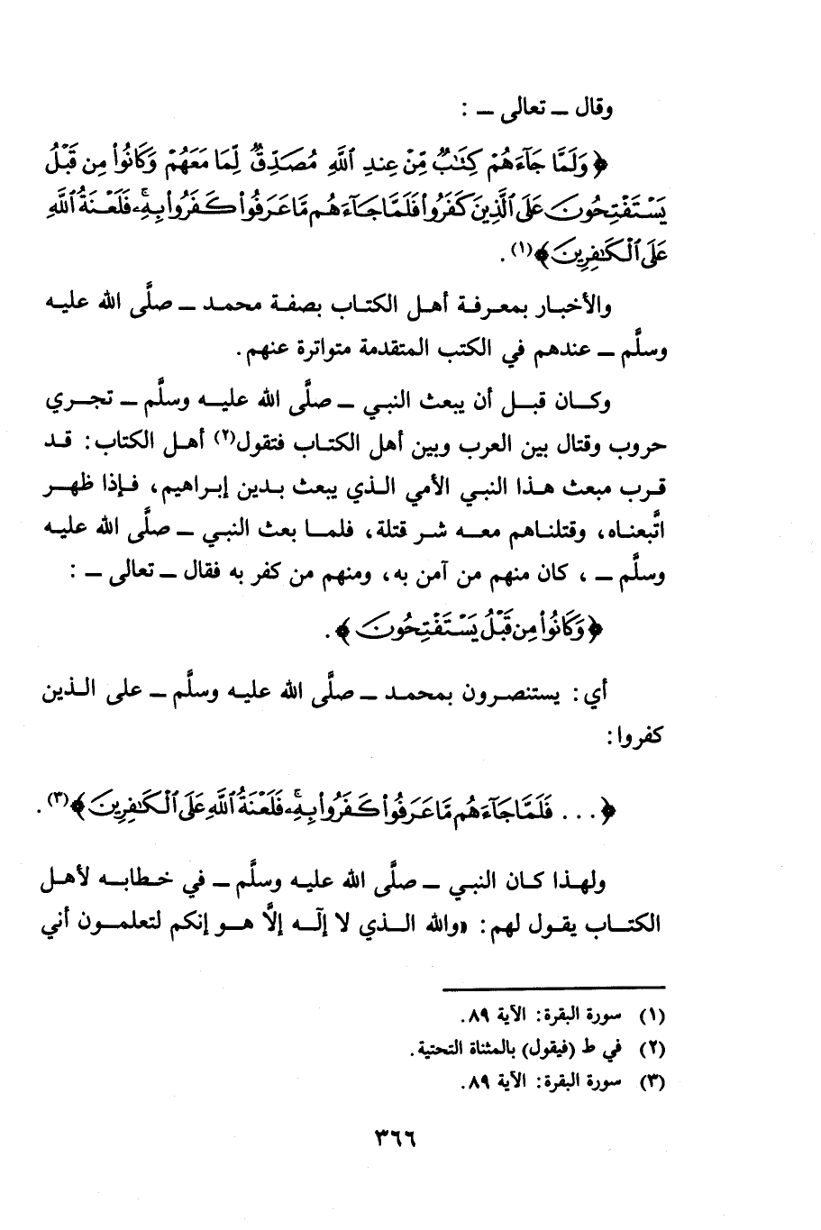 وَقَالَ - تَعَالَى -: {وَلَمَّا جَاءَهُمْ كِتَابٌ مِنْ عِنْدِ اللَّهِ مُصَدِّقٌ لِمَا مَعَهُمْ وَكَانُوا مِنْ قَبْلُ يَسْتَفْتِحُونَ عَلَى الَّذِينَ كَفَرُوا فَلَمَّا جَاءَهُمْ مَا عَرَفُوا كَفَرُوا بِهِ فَلَعْنَةُ اللَّهِ عَلَى الْكَافِرِينَ} [البقرة: 89] وَالْأَخْبَارُ بِمَعْرِفَةِ أَهْلِ الْكِتَابِ بِصِفَةِ مُحَمَّدٍ - صَلَّى اللَّهُ عَلَيْهِ وَسَلَّمَ - عِنْدَهُمْ فِي الْكُتُبِ الْمُتَقَدِّمَةِ مُتَوَاتِرَةٌ عَنْهُمْ.